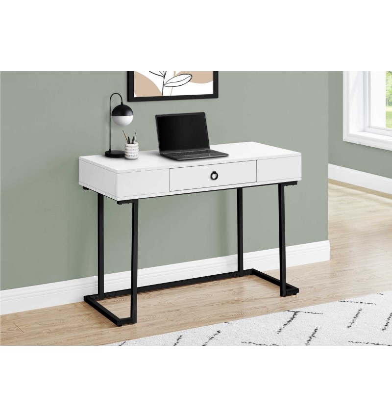 Trendy computer desk finished in a modern white laminate, with attractive black metal legs in a reverse C-shape shape design