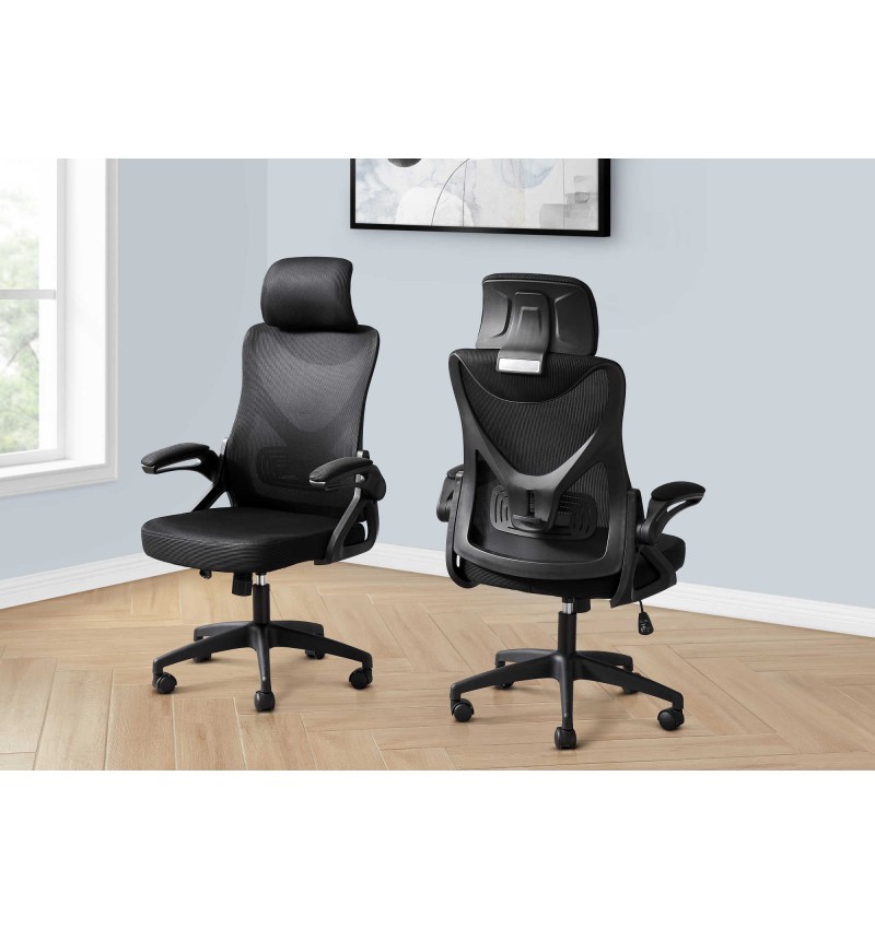 Bring some fashionable style and comfort to your office space with this executive, black mesh office chair. This durably designed chair features a high back and foam cushioning for ultimate comfort during those long workdays. The breathable black mesh upholstery and headrest provide added support and airflow, keeping you cool and comfortable. With adjustable height and headrest as well as swivel capabilities, this ergonomic chair is perfect for any home or commercial office setting. The black metal base and wheels make it easy to move around your workspace, while the contemporary design adds some flair. Easy to assemble with illustrated instructions and all parts included, this executive style upholstered chair is backed by a 5 year limited warranty against any defects for your convenience.