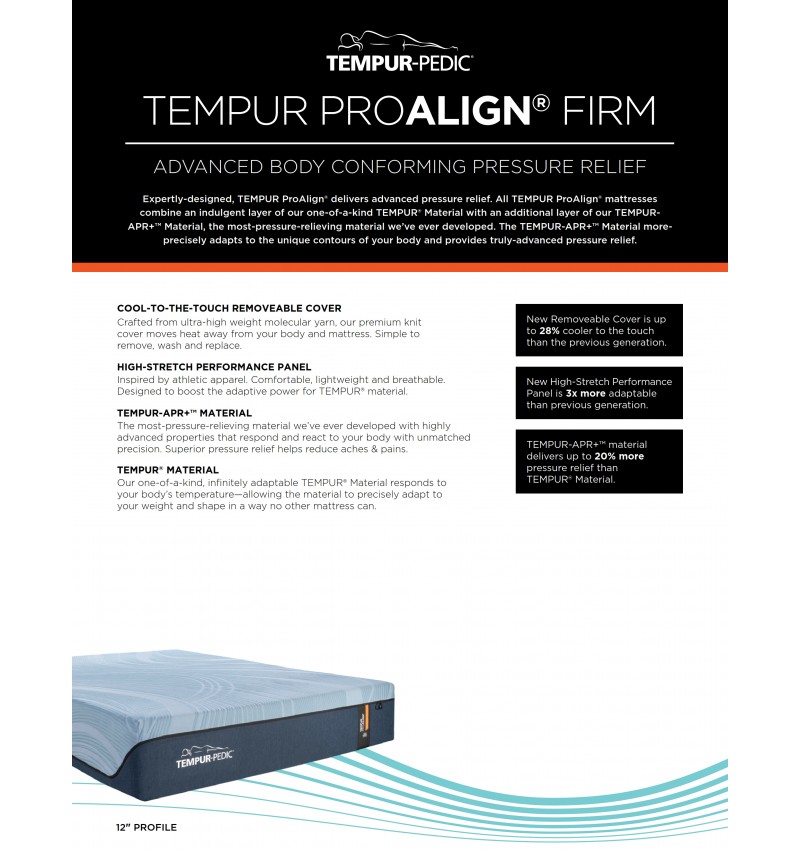 Get the original soft where you want it, firm where you need it comfort and support with the TEMPUR-ProAlign™ Firm memory foam mattress. You’ll find more to love, with a moisture-wicking cool-to-the-touch advanced fabric cover and an integrated phase change material beneath the surface for increased comfort.