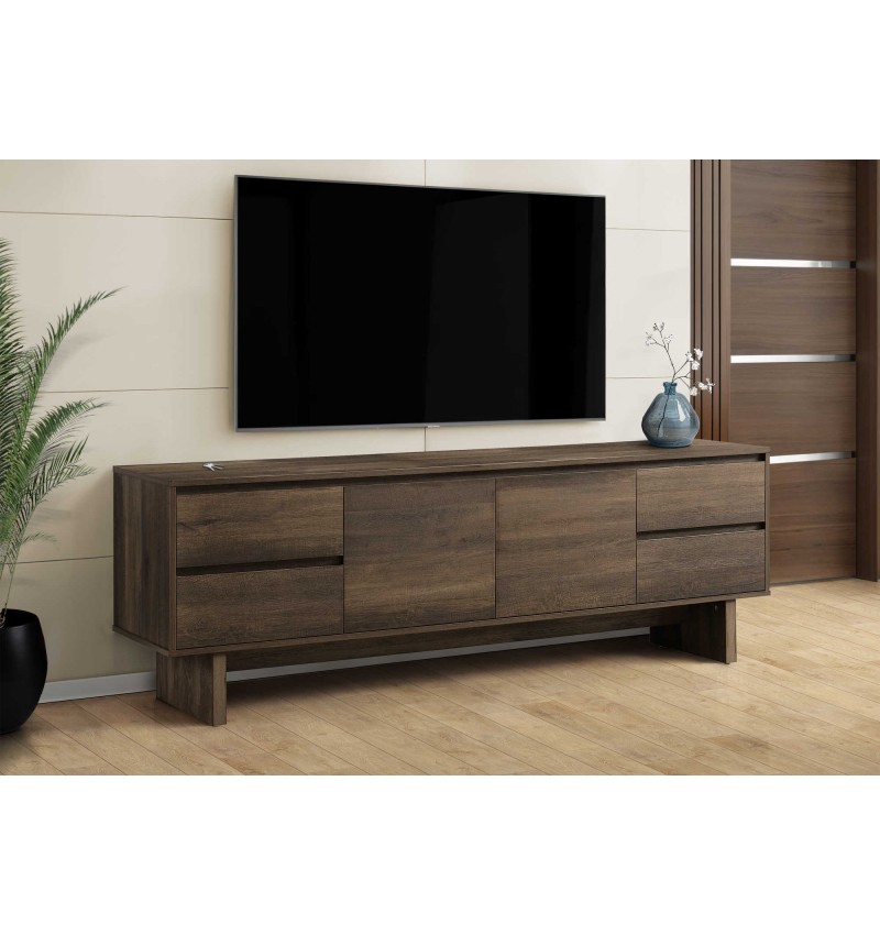 Elevate your home entertainment setup with this trendy, transitional style 72 inch tv stand finished in a sleek wood-look dark brown laminate on all sides.