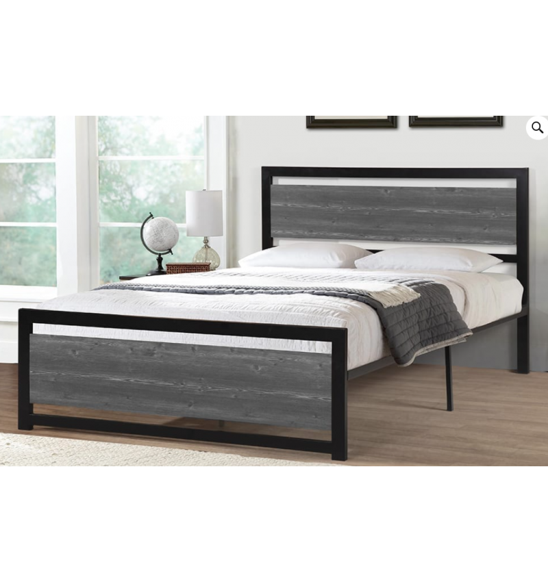 Our platform bed boasts a bold and contemporary design with its sharp lines, metal frame, and distinctive distressed grey wood finish. It’s not just a bed; it’s a work of art.