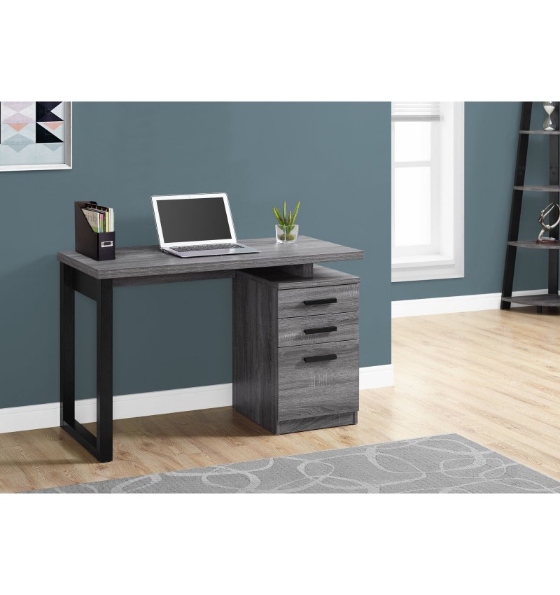Space saving and functionality are combined in this rustic industrial style computer desk. It features three storage drawers that can be assembled on the left or right hand side, accented with bold black metal handles, and includes a file drawer to hang standard or legal sized documents. The smooth desk top has enough space for a laptop, a lamp, and accessories to keep it all within each reach. Finished in a contemporary two tone black and grey wood-look, this modern computer desk will be a stand out in a home office, student dorm, or anywhere in your home.
