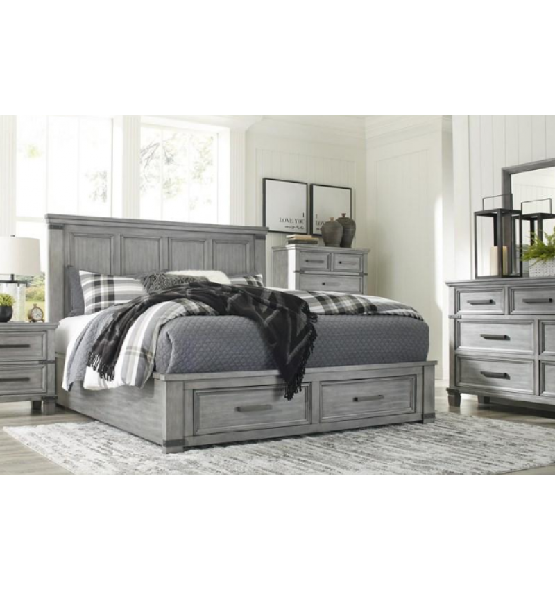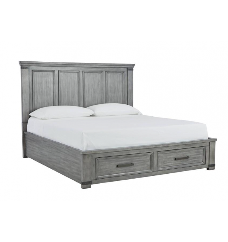 With its light weathered gray coloration, this storage bed conveys trend-right urban farmhouse style. Thick-profiled top moulding on the tall, mansion-scale headboard lends a fresh take on a timeless design. The footboard features two storage drawers with profiled frames and dovetail construction. Bar pulls and metal straps in a dark aged bronze tone add to the rustic-yet-refined aesthetic.