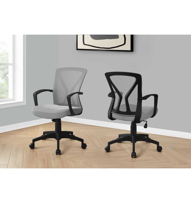 Mid-back office chair with fixed armrests in black, with breathable, polyester mesh fabric in grey