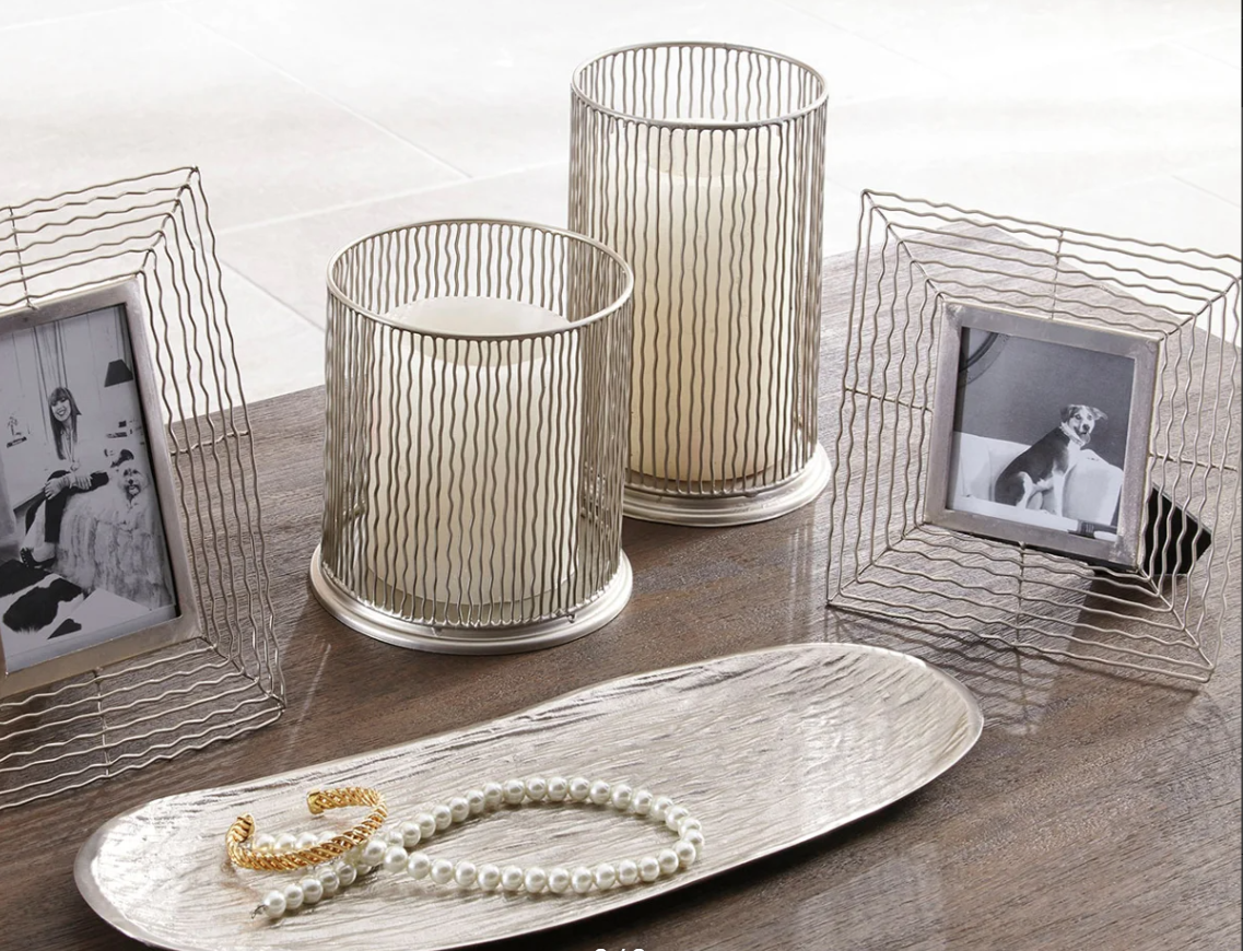 Make some waves with this highly contemporary accessory collection. Wonderfully open and airy, the wavy metal frames and hurricane candle holders beautifully go with the flow. Organic shaped tray is a natural complement.
