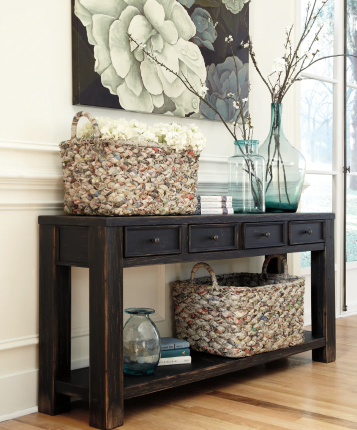 nspired by the sheer simplicity and weatherworn beauty of primitive furniture, this sofa table brings a relaxed sense of style into your space. Show off accent pieces on the bottom shelf, while concealing whatnots in the handy drawers.