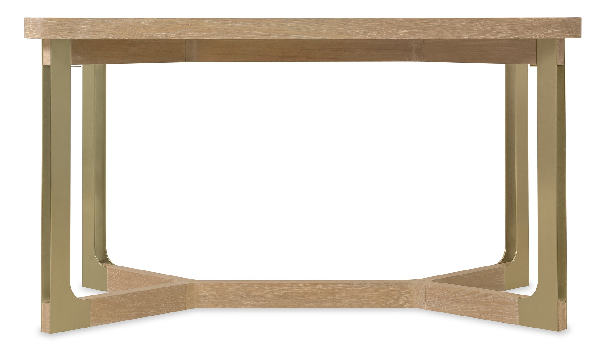• Featuring a rectangular design with a white oak veneer top and metal legs in a brushed brass finish, this table is perfect for casual dining or kitchen islands