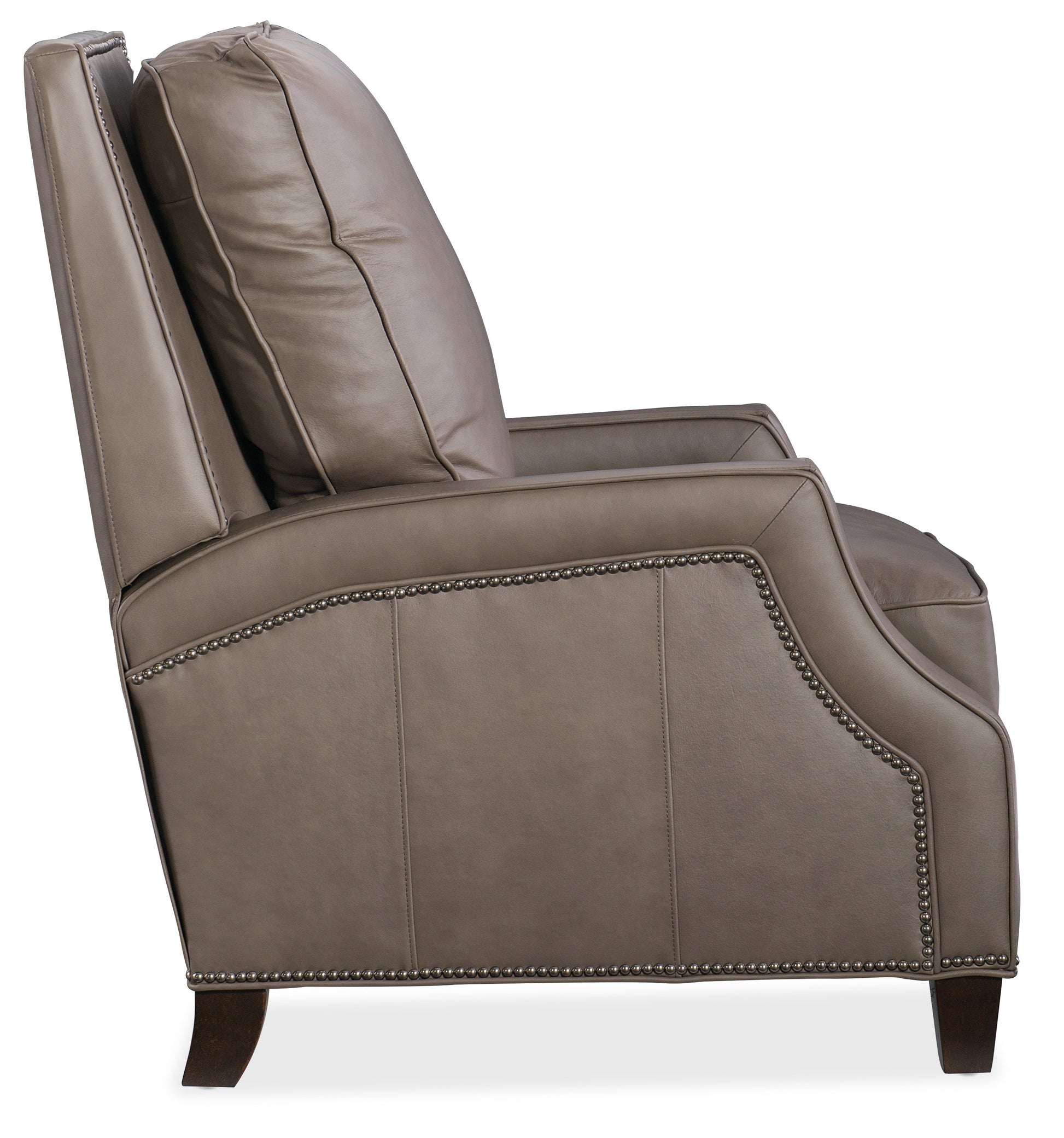 • The manual recliner pairs the Aspen Lenado finished leather cover in a taupe color with wood legs in the Natchez Brown finish for a warm and welcoming combination