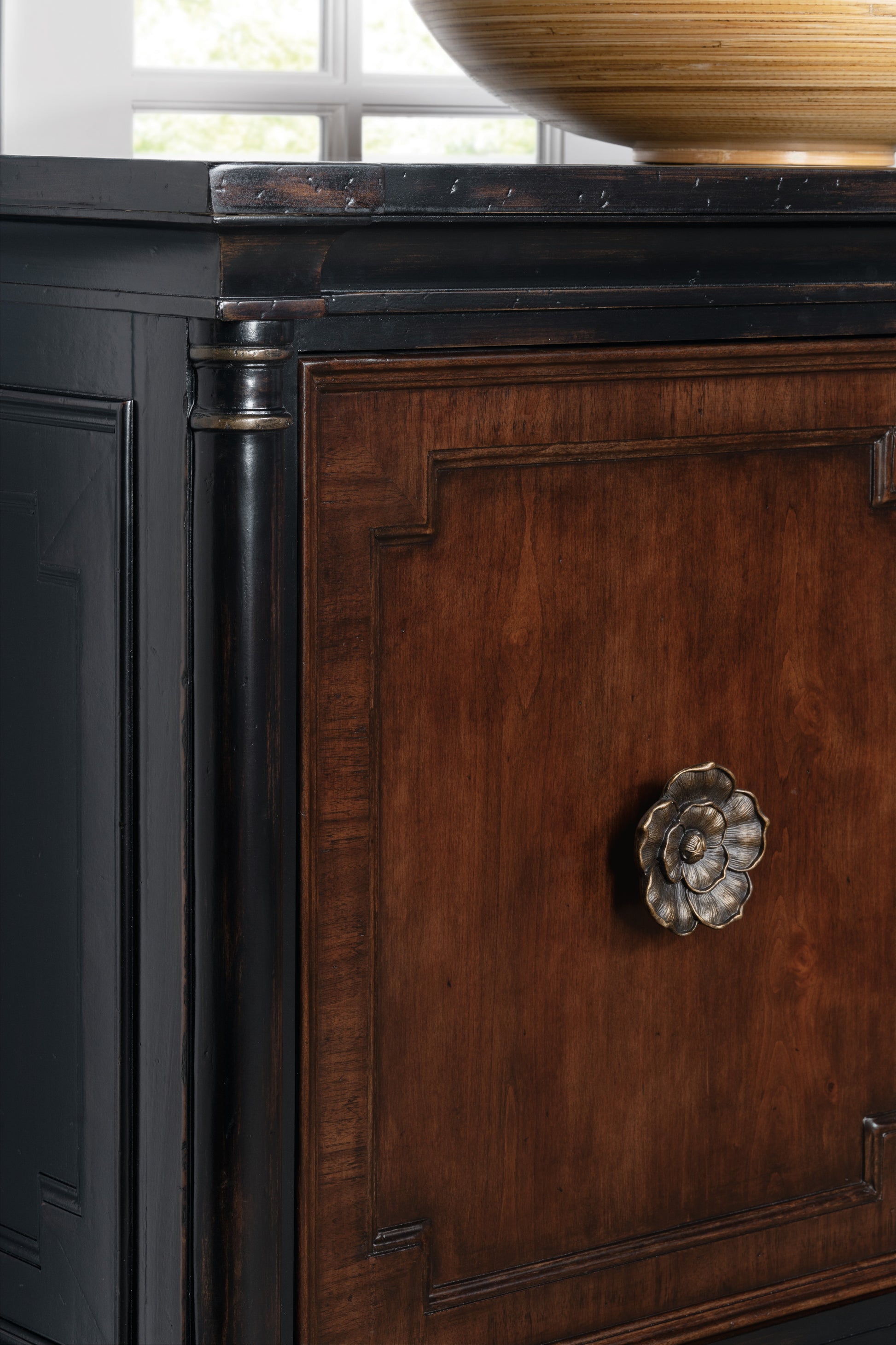 • The traditional soul of the collection is set apart by translucent cathedral cherry veneers, exotic walnut and maple inlays, age worn black cherry accents, and custom antique burnished hardware