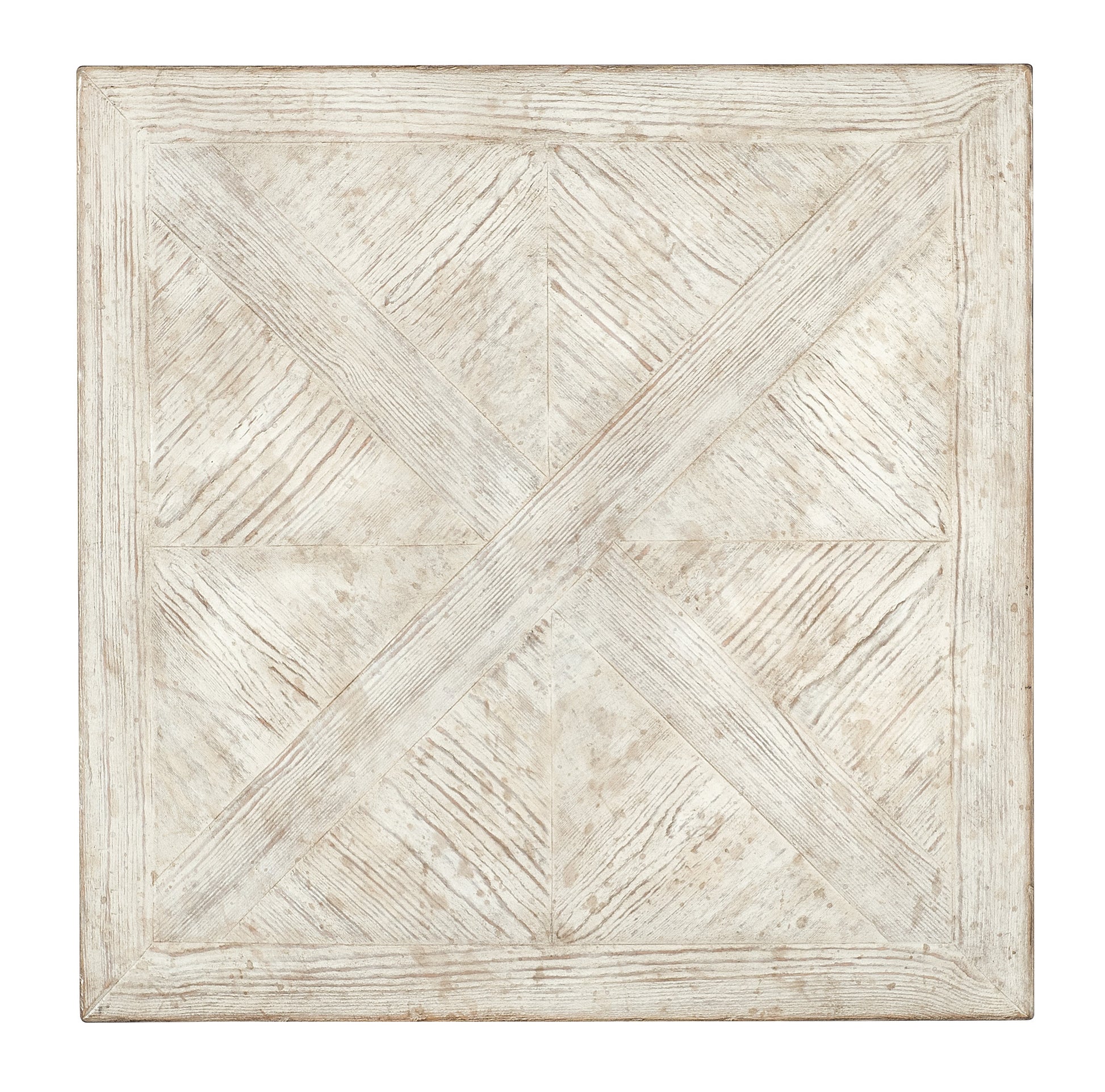 • In a cube-like form, the 24-inch square Block Buster End Table is crafted of Pine with parquet-patterned veneers in a creamy white finish with rub-through and distressing and a plinth base