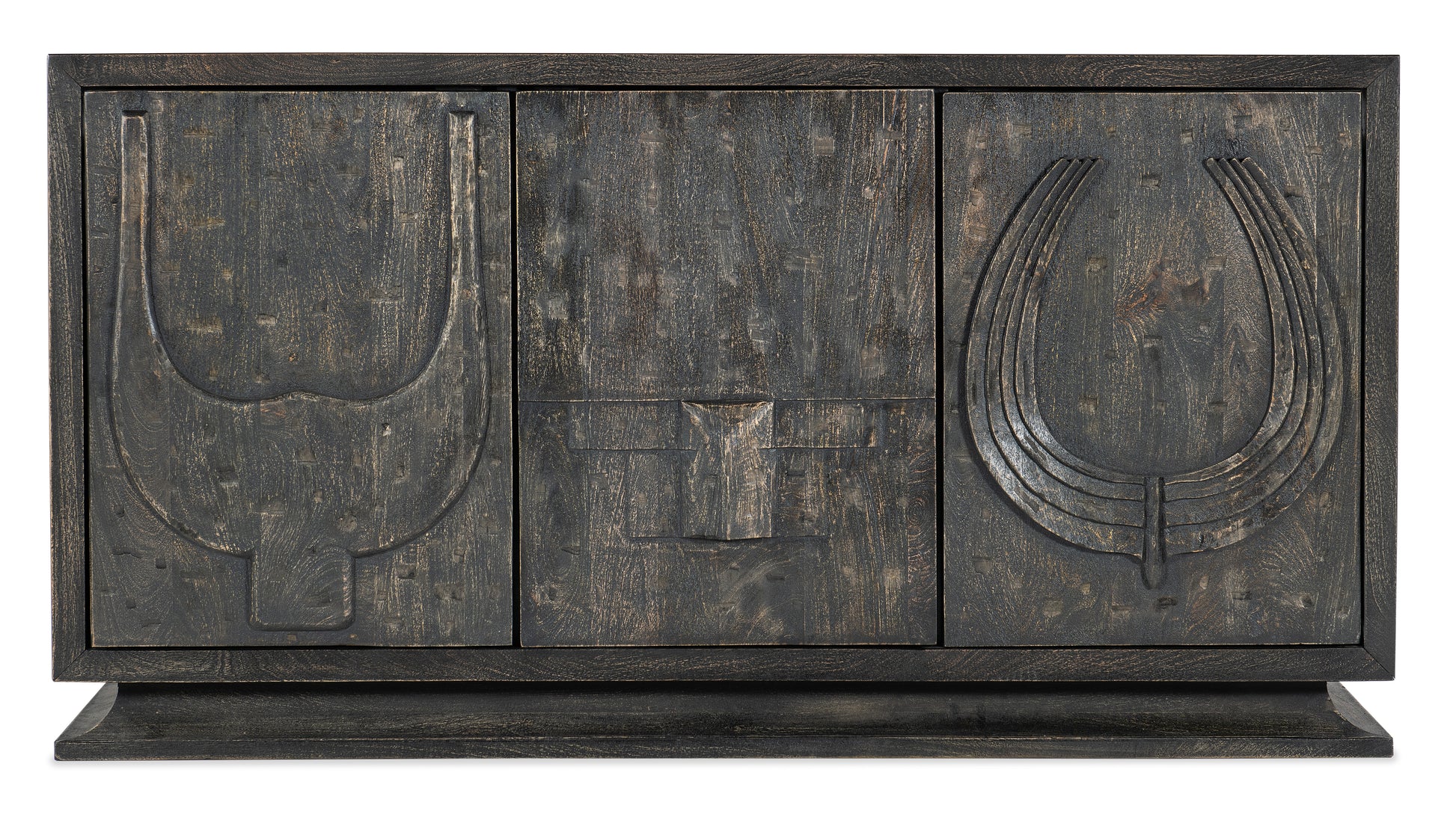 • Casual, rustic and youthful, the Commerce & Market Credenza is crafted of Mango Solids with a dark natural finish and features a tribal motif on the door fronts