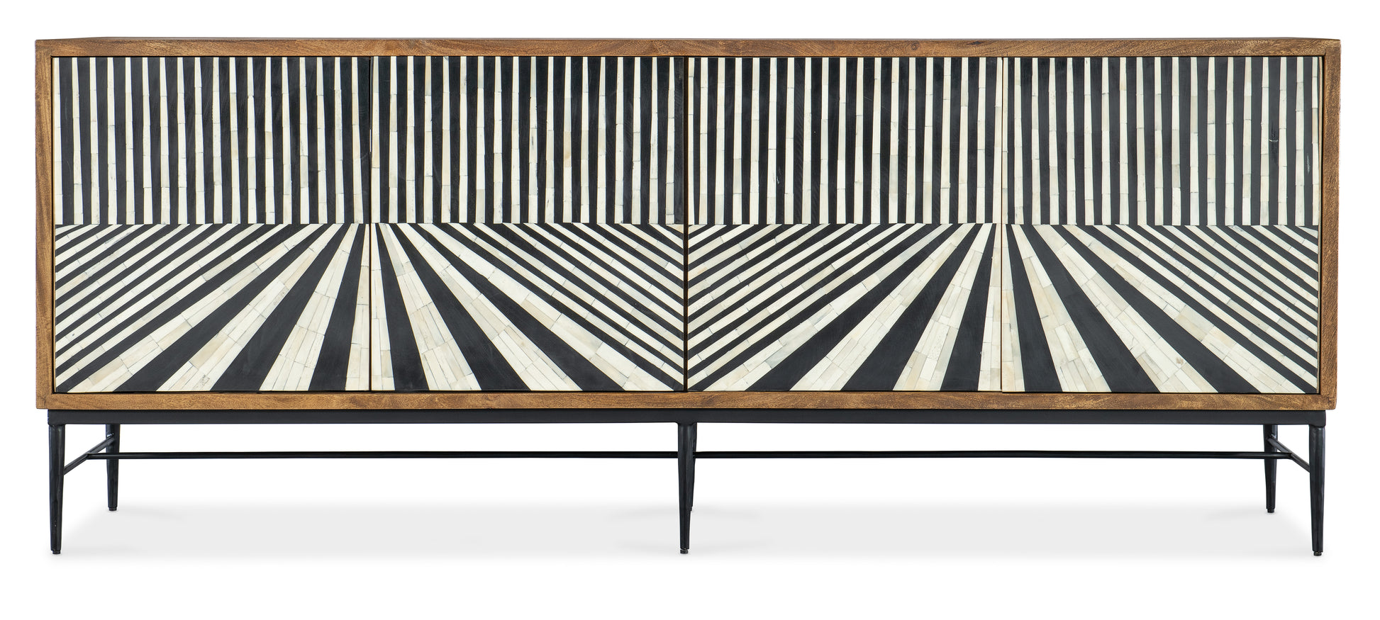 • In a classic black and white color scheme with a casual modern twist, the Linear Perspective has a natural medium wood finish over Mango Solid Wood accented by black and white bone inlay on the door fronts and a black metal base