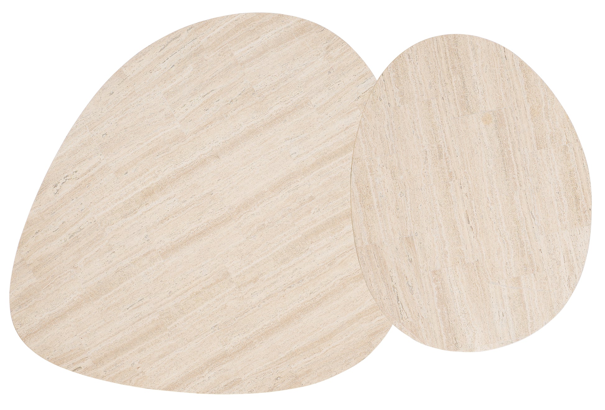 • A harmonious blending of soothing round shapes and natural materials, the Commerce & Market Nesting Cocktail Tables each have White Travertine parquet tops and charcoal gray metal legs