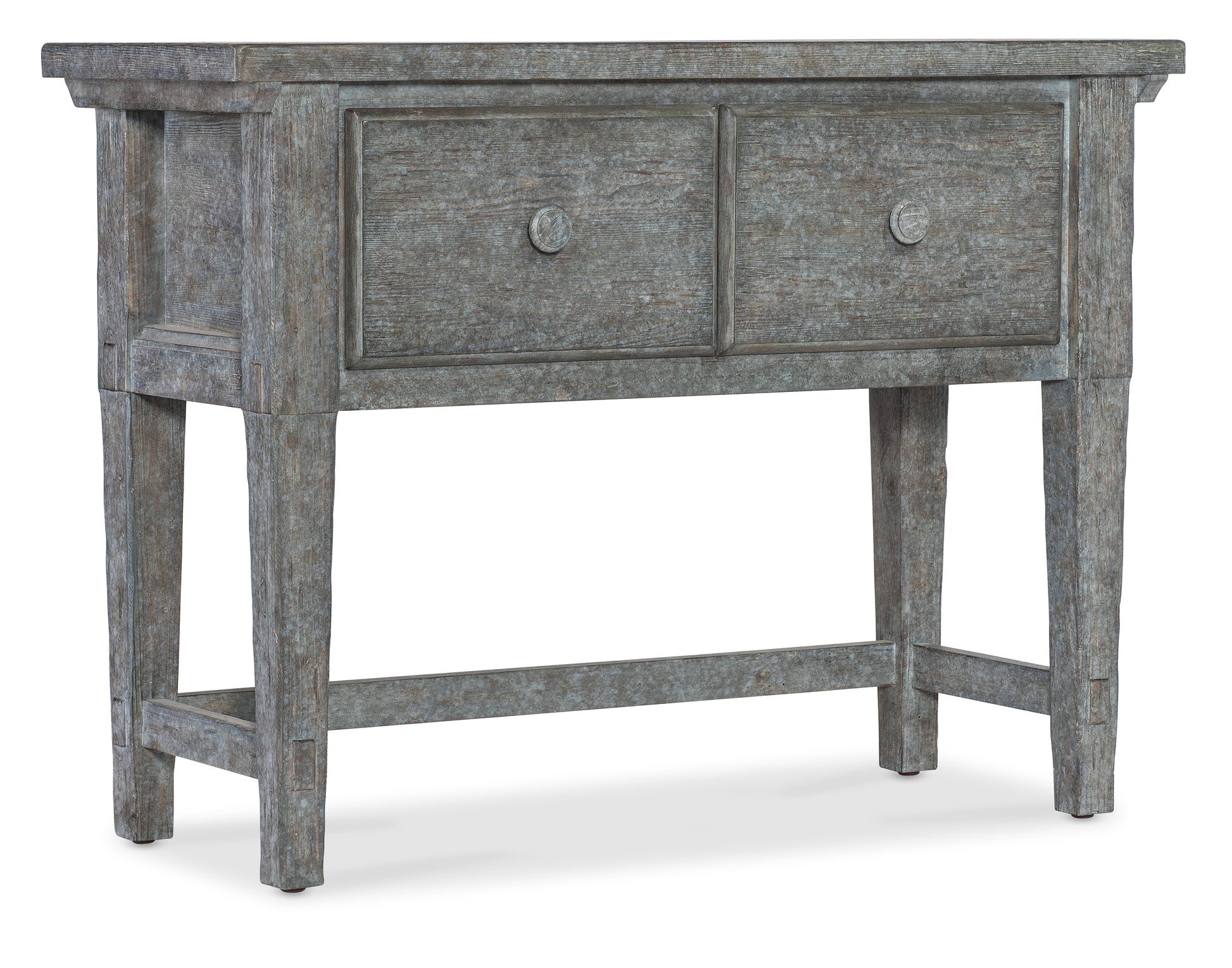 • Crafted of Pine Veneers with a distressed blue finish, tapered legs and an interlocking design on the stretcher and frame, it has two drawers with soft-close guides.Targeting the next generation of furniture buyers, Hooker unveils the Commerce & Market brand of accent and occasional pieces