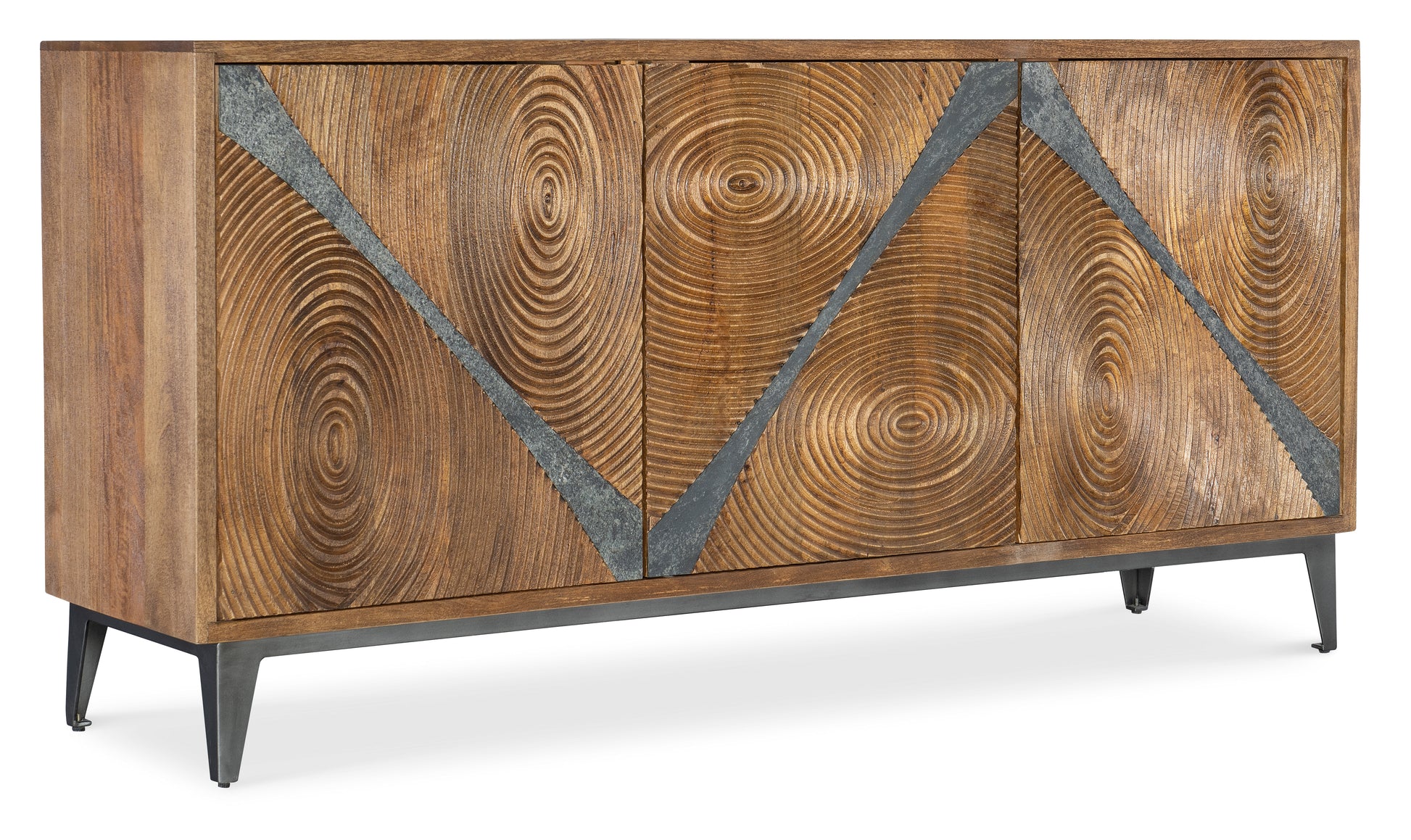 • Organic and eclectic, the Vortex Credenza has a grooved swirl design on the door fronts in slate inlay, contrasting with the medium wood finish over Mango solid wood