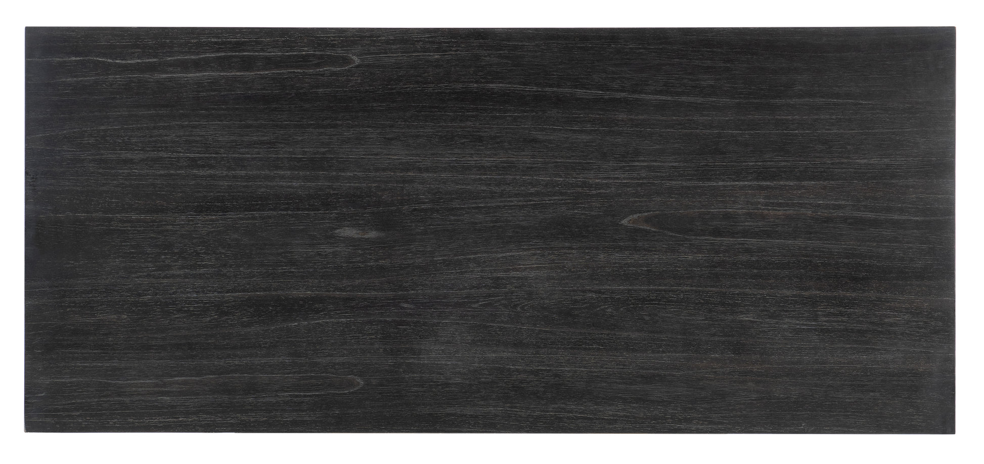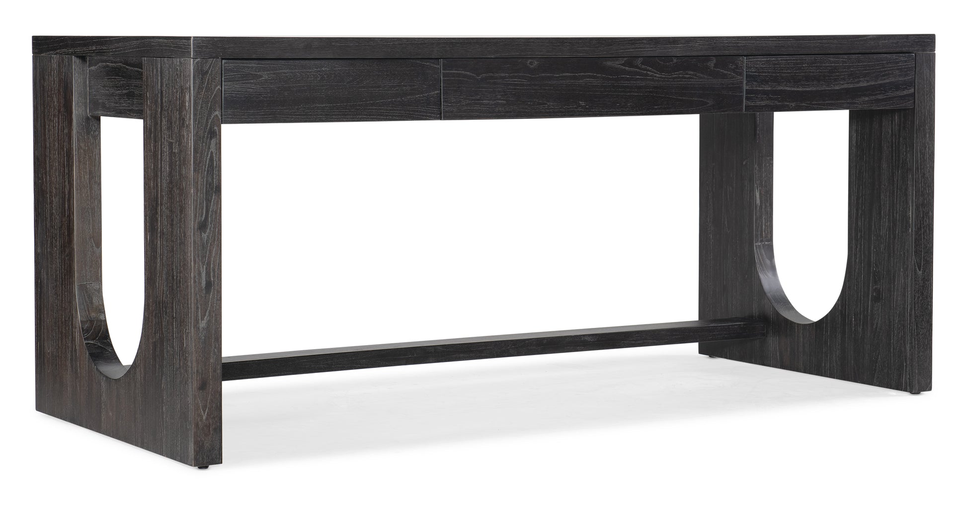 • Set a youthful, energetic tone in your work space with the Commerce & Market Writing Desk, crafted of Mindi Veneers with a black finish with the wood grain showing through