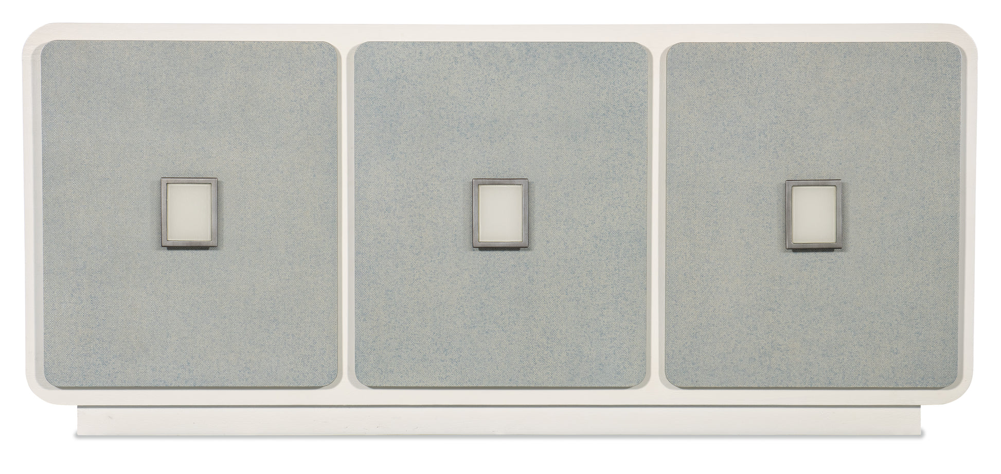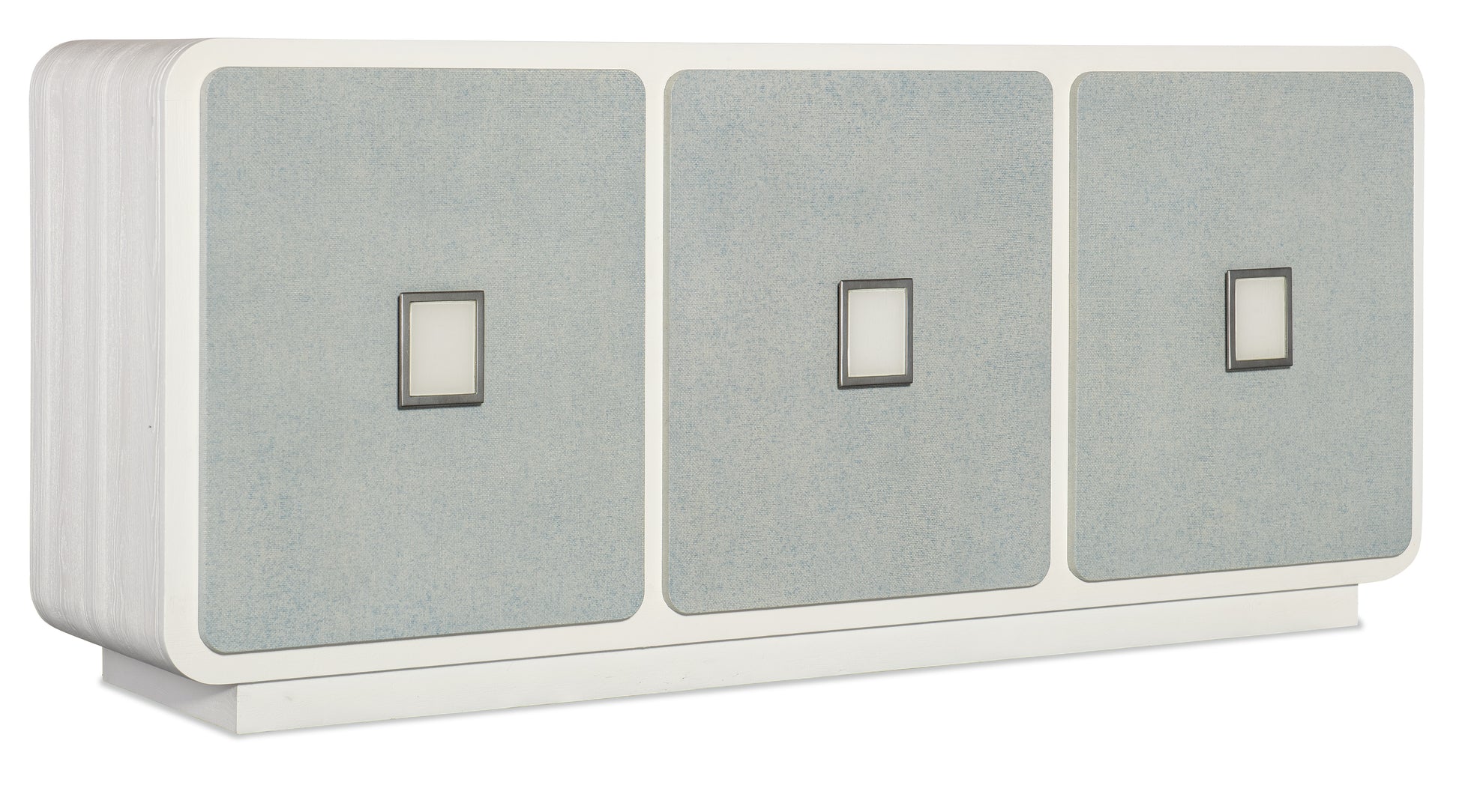 • Serene and stylish with a spa-like color scheme, the modern Atlantis Entertainment Credenza has rounded corners on a rectangle shape, raffia-wrapped door fronts and a creamy white plinth base, sides and front