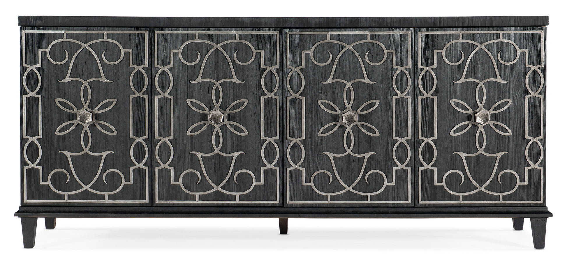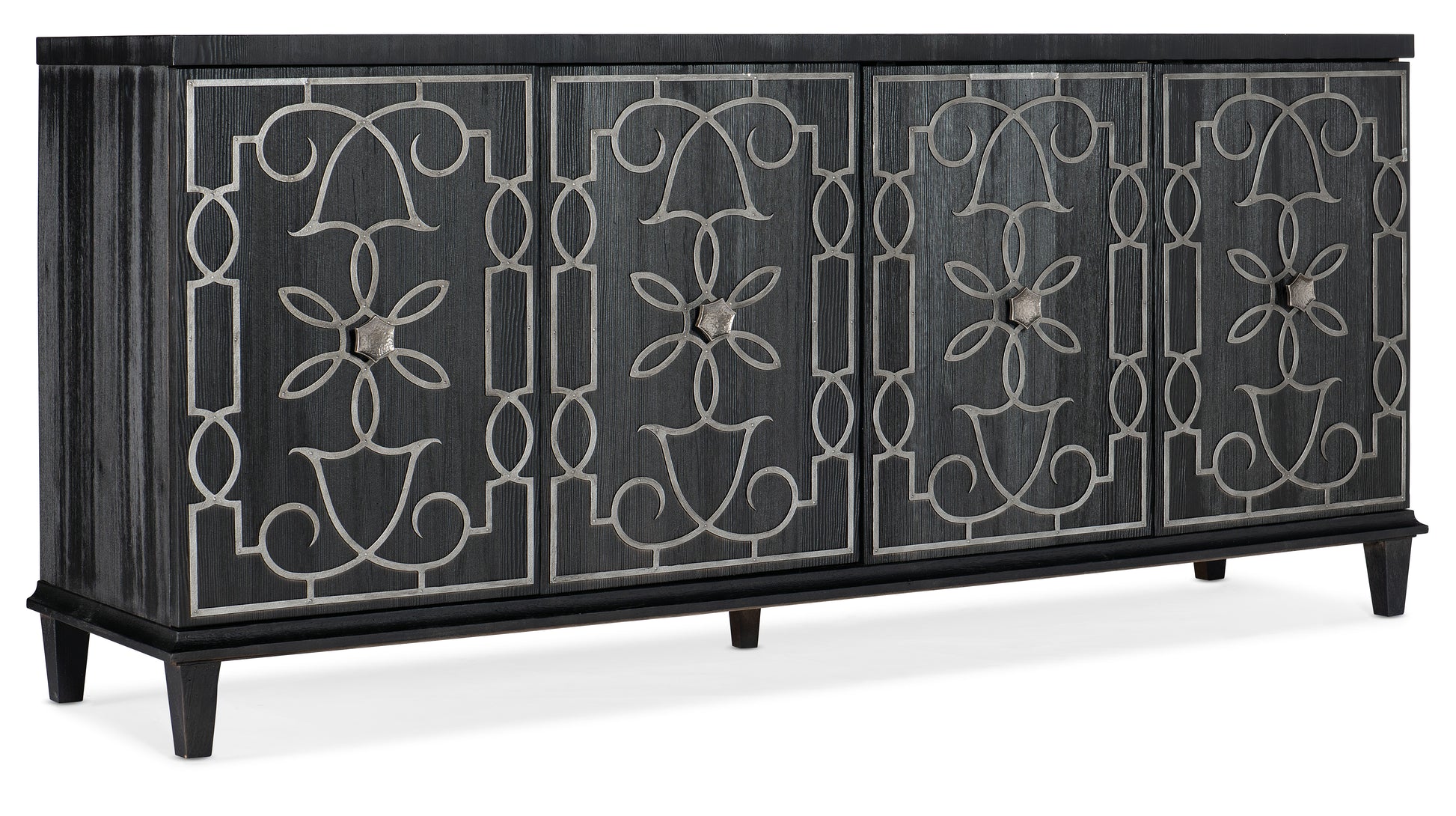 • With a Moroccan flair and an elegant black and silver color scheme, the Madeline Credenza is crafted of Pine Veneers with a black wood finish, textured metal hexagonal knobs and silver floral motif accents
