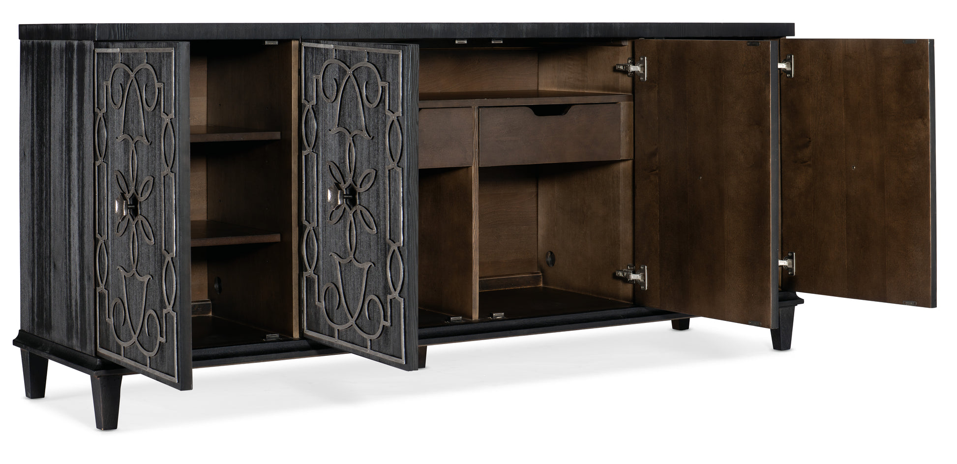• With four doors, there are two drawers behind each pair of center doors, two adjustable shelves behind each outside door and one fixed shelf above the drawer in the center section