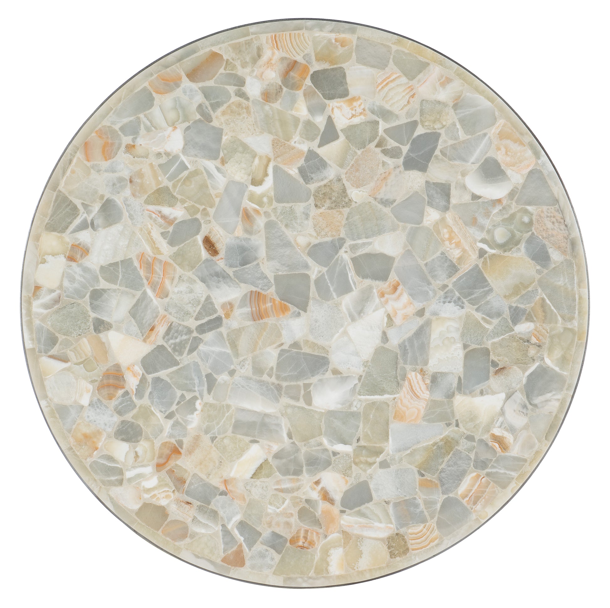 • With a convenient round shape, the Marin Round Cocktail Table combines Pewter Metal on a geometrically-shaped interwoven base with a Tumbled White Onyx top with shades of grays, creams and golds for an eclectic blending of elegant, organic materials in a medley of rich neutrals.Come closer to Melange, and you will discover something unexpected