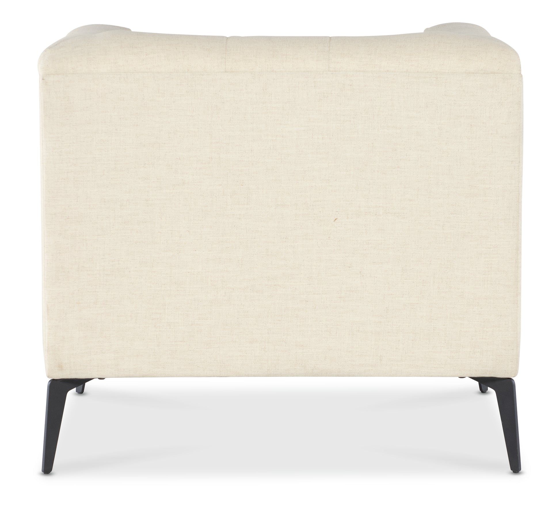 • With a chesterfield-inspired shelter arm design and button tufted interior, the chair stands out with its light, airy appearance, thanks to tall matte black metal tapered legs