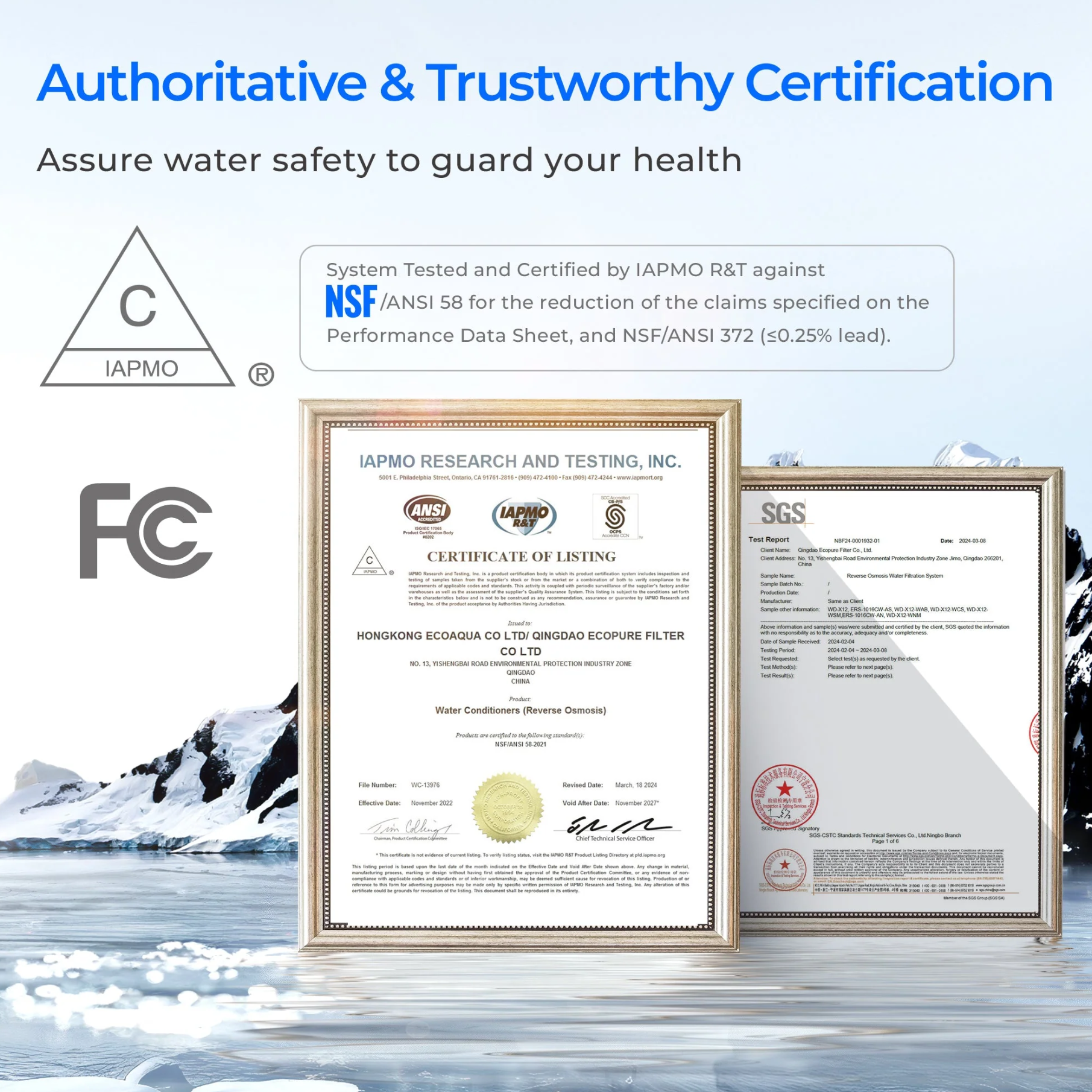 - [11-stage RO Filtration]: This reverse osmosis system features 11-stage precision filtration including a robust 0.0001μm RO membrane, composed of 16 layers. Enhanced with an LED light for assured water safety. It has been tested by SGS to reduce TDS, PFOA, PFOS, Chlorine, Fluoride, Arsenic, Lead, and more, delivering healthy, pure water for you.