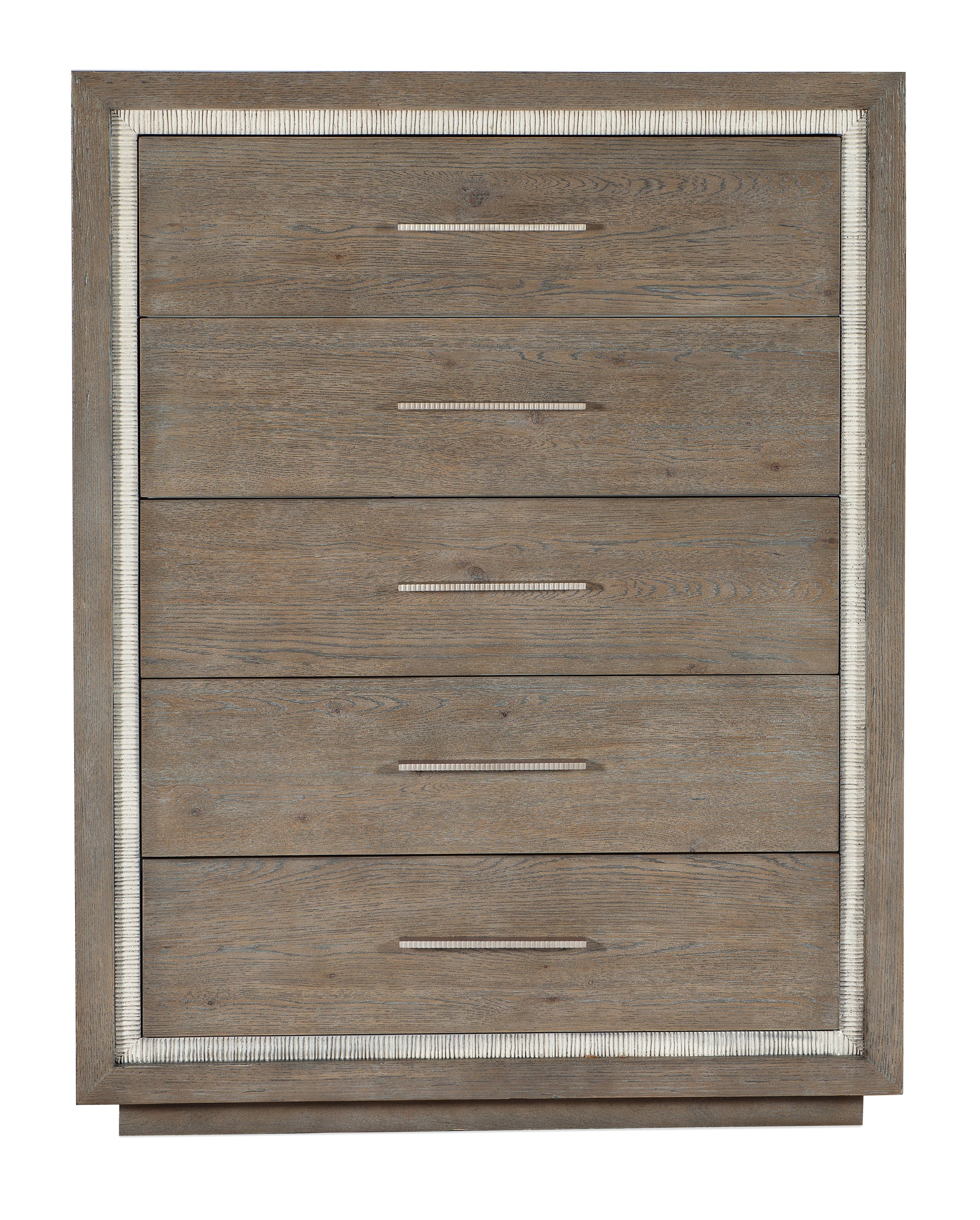 • In a crisp two-tone finish combining a gray washed oak with a contrasting textured light gray color, the Serenity Five-Drawer Chest brings the organic textures of cottage waterfront living to your space