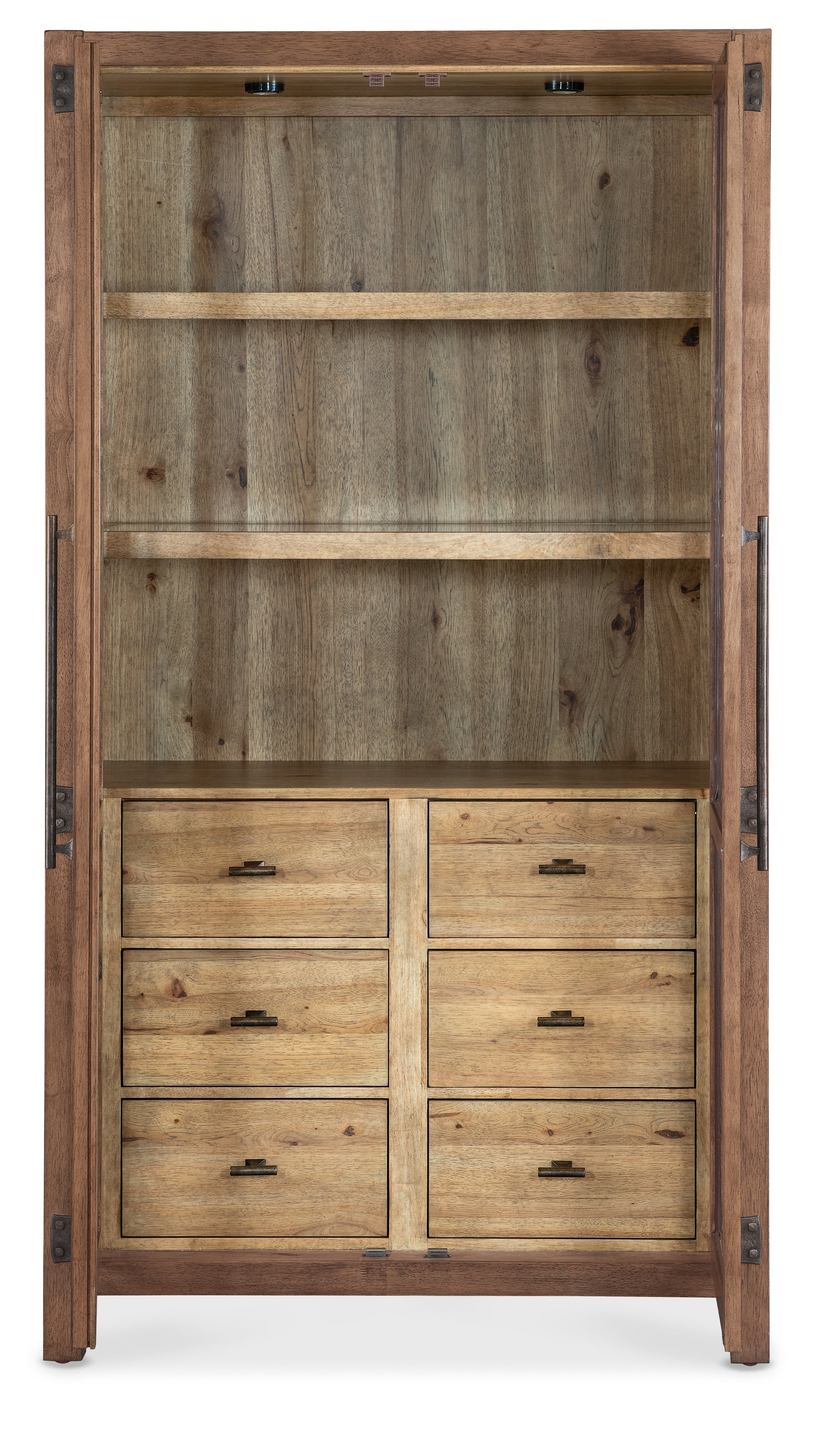 • Inspired by California wine country and influenced by the quaint bungalows and craftsman architecture of the region, the Vineyard Row Display Cabinet is made of Pecky Hickory and White Oak Veneers with wood-framed seeded glass doors with rustic hammered metal hinge accents