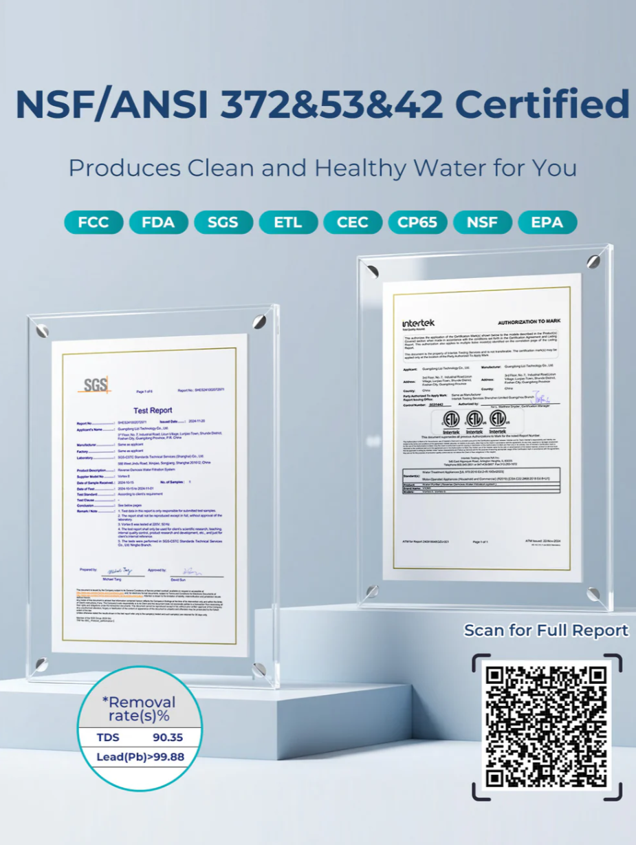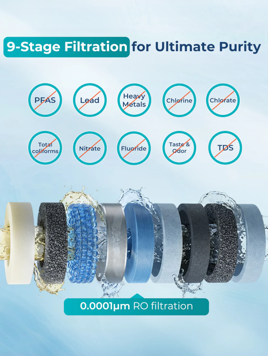 - ใ๐๐๐๐ฎ๐๐๐ฌ ๐๐๐ & ๐๐ ๐๐/๐๐ ๐๐ &ย ๐๐ข๐๐ซ๐จ๐ฉ๐ฅ๐๐ฌ๐ญ๐ข๐๐ฌใ Our 9-Stage reverse osmosis Filtration effectively reduces total dissolved solids (TDS), PFOA, PFOS, chlorine, chloramine, lead, heavy metals and other harmful substances in water. With a filtration precision of 0.0001 ฮผm, so you can trust every drop of your drinking water. (Tested by official third-party laboratory (SGS)).