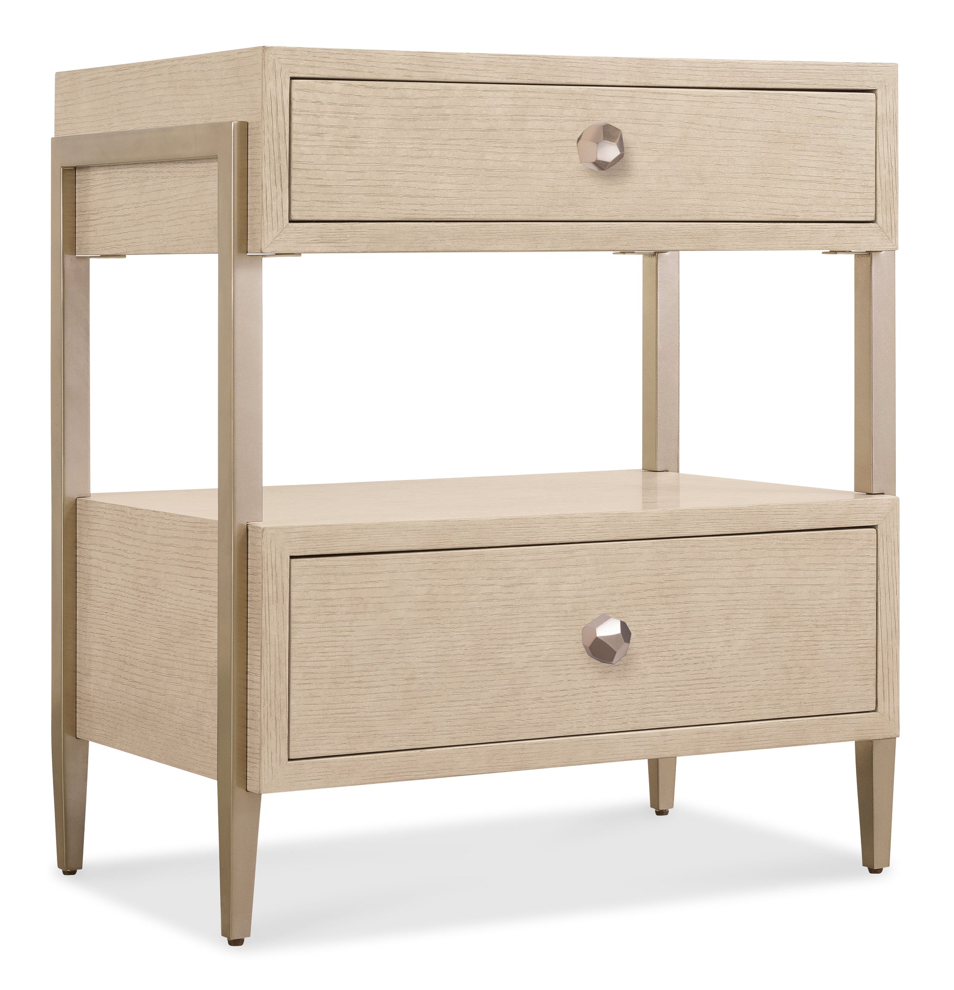 • The Polished Limestone finish on quartered oak veneers adds a modern, elegant touch, making this nightstand perfect for contemporary bedrooms
