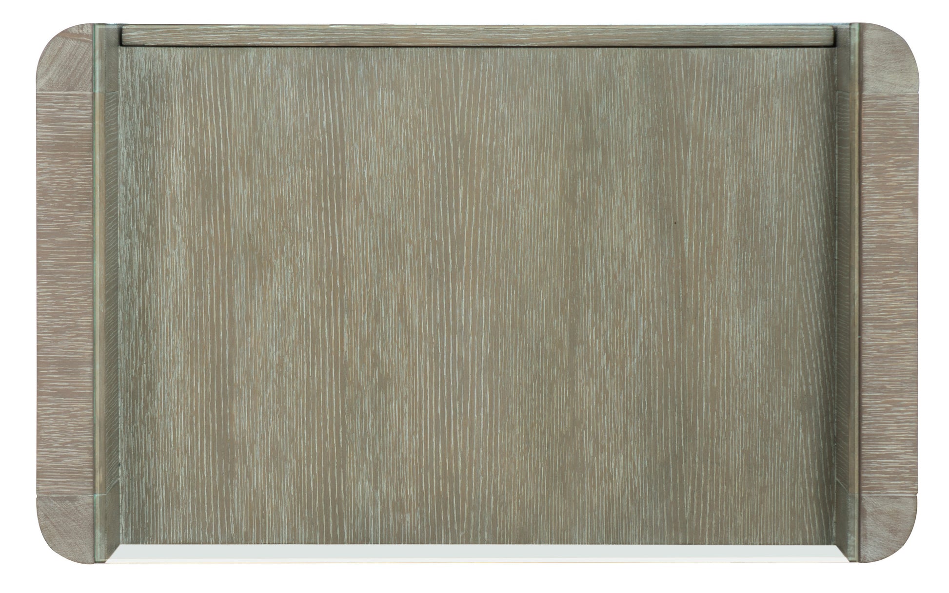 • Affinity 三抽屉床头柜风格自然低调,兼具休闲现代感,四分之一橡木贴面采用灰褐色喷砂饰面,搭配玻璃顶架,并以奶油色和锡色条形拉手点缀。