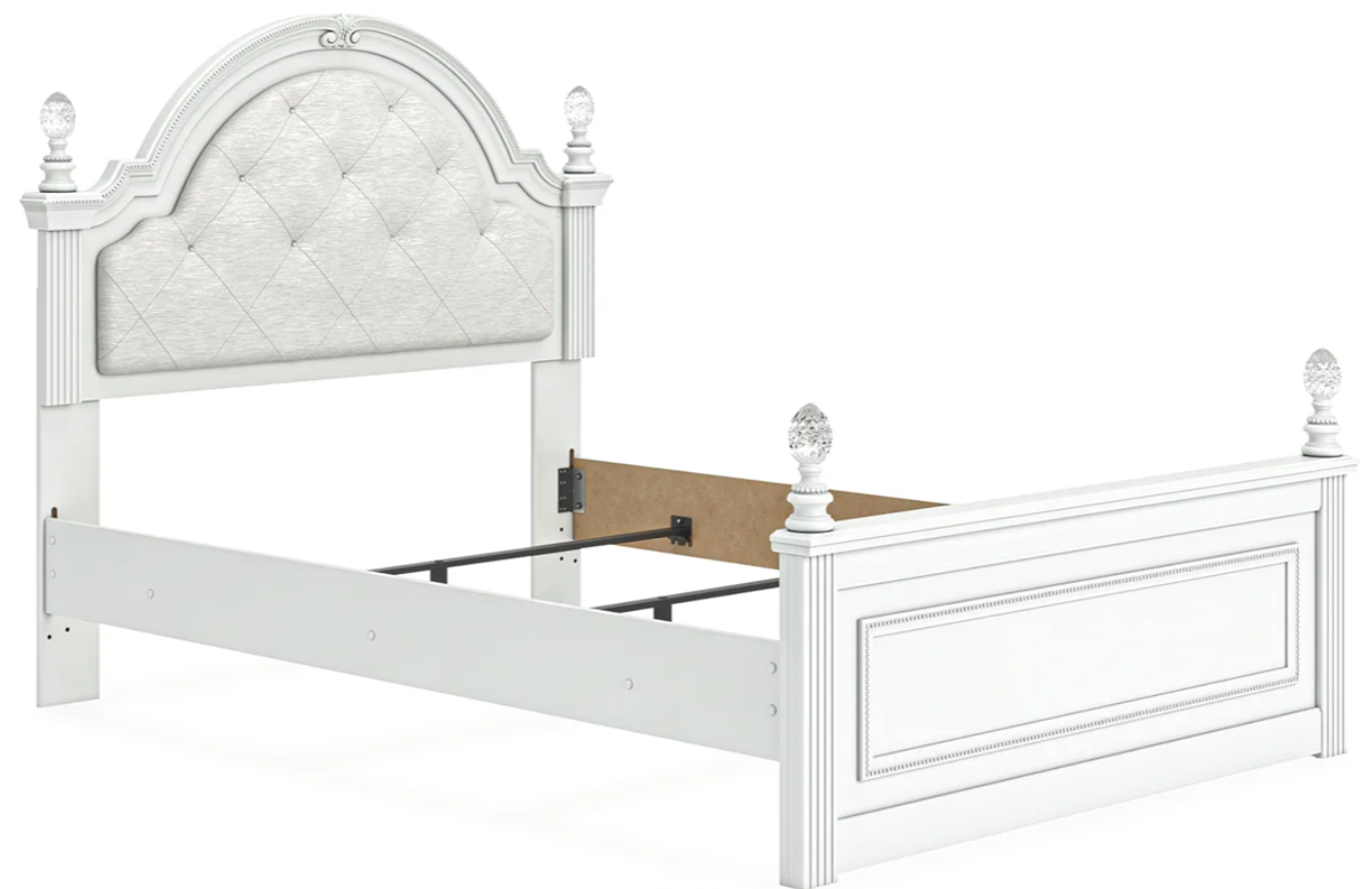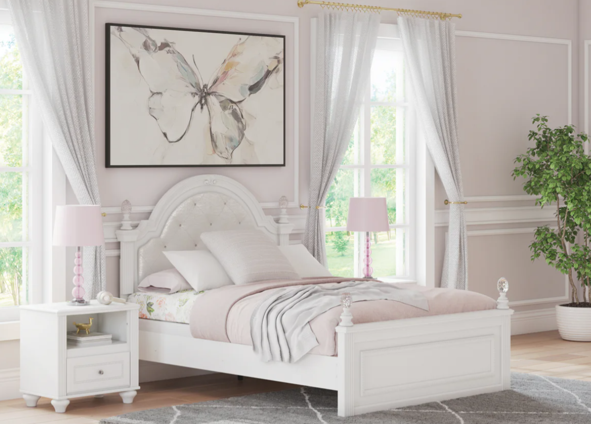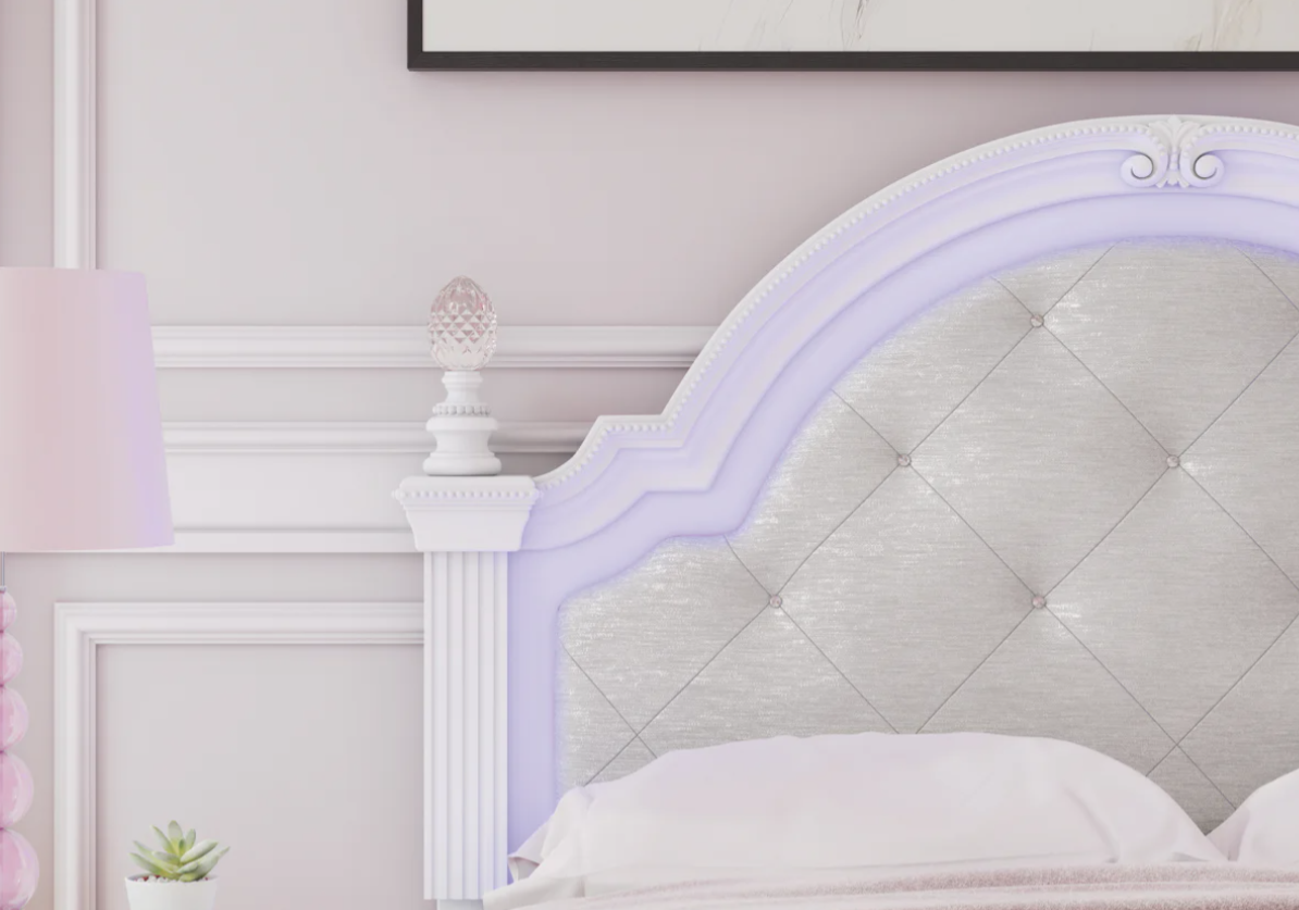 Fit for a princess. This upholstered panel bed’s crisp matte white finish pairs with charming ornate beading and sumptuous button-tufted upholstery—perfect for your girly girl. Decorative ball tops and multicolored LED lighting in the headboard are the crowning touches to make your little one feel like royalty.
