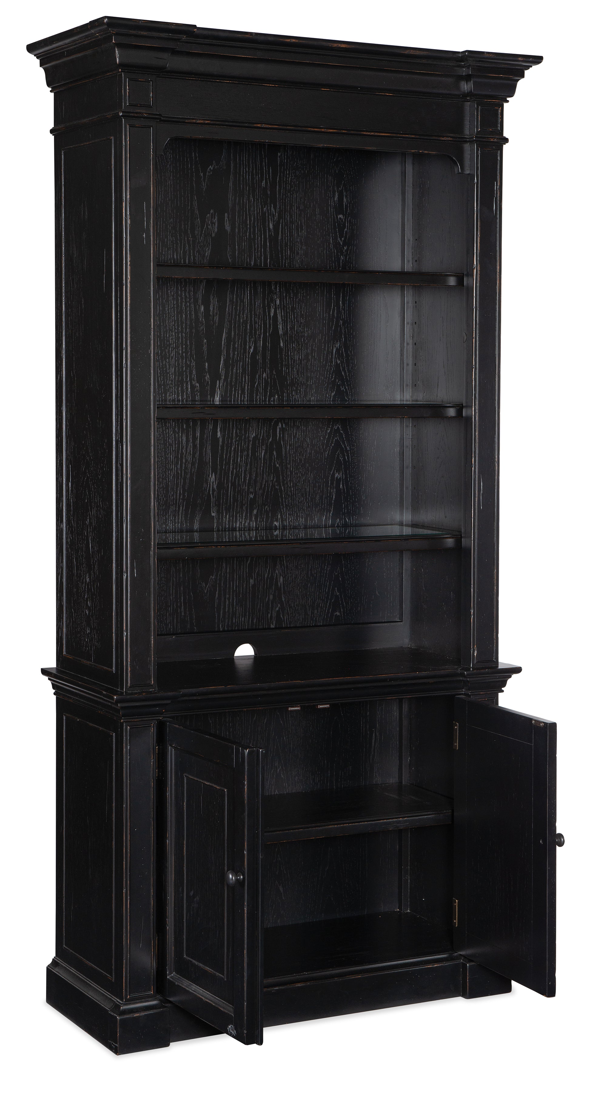 这款书柜采用胡桃木贴面,饰以燕尾服黑漆,并点缀以暖棕色,配有两扇柜门,门后设有一个可调节隔板,另有三个可调节木质隔板。