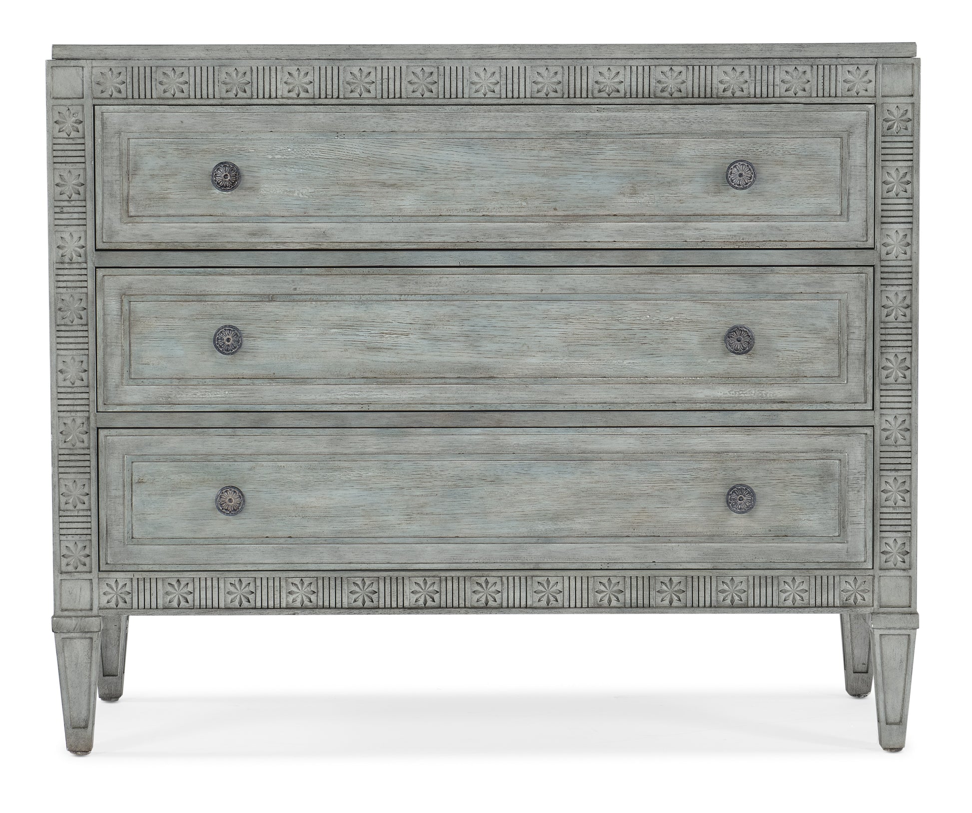 查尔斯顿三屉边柜,散发着南方沿海地区的复古魅力,饰有精美的花卉雕刻和锥形柜腿。