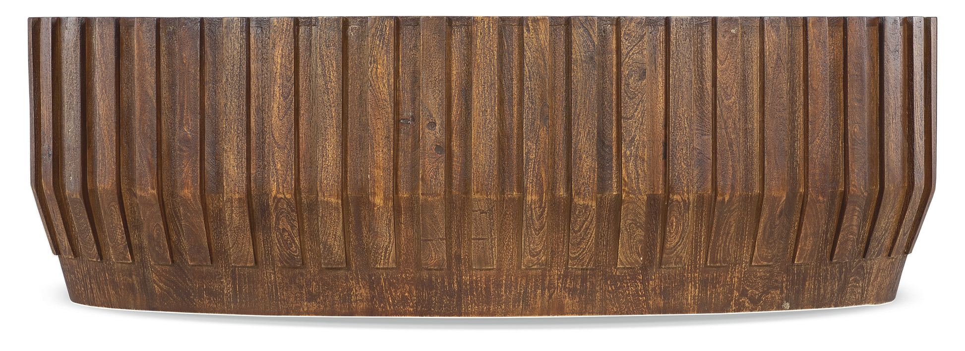 这款 58 英寸宽的椭圆形 Gears 鸡尾酒桌,将工业风与自然风完美融合。它采用芒果实木打造,饰以天然中色木纹,并以齿轮图案的罗纹设计点缀。Hooker 推出 Commerce & Market 品牌,旨在吸引新一代家具买家,该品牌包含一系列装饰性和休闲家具。
