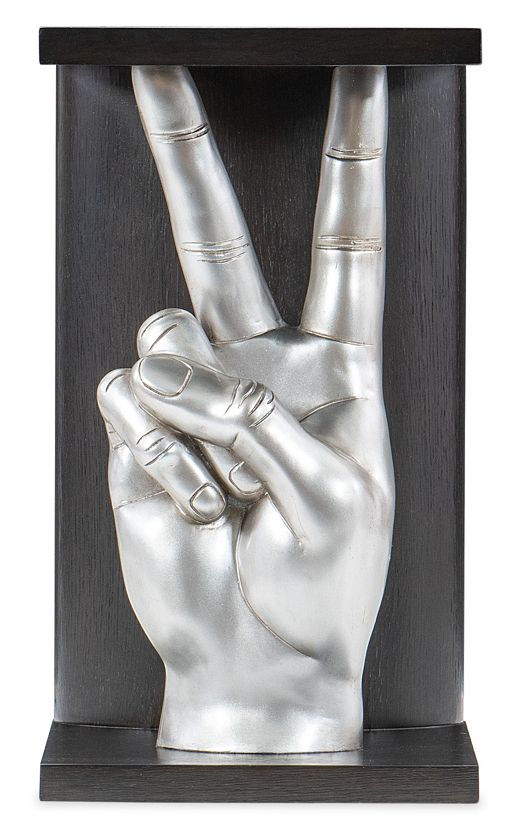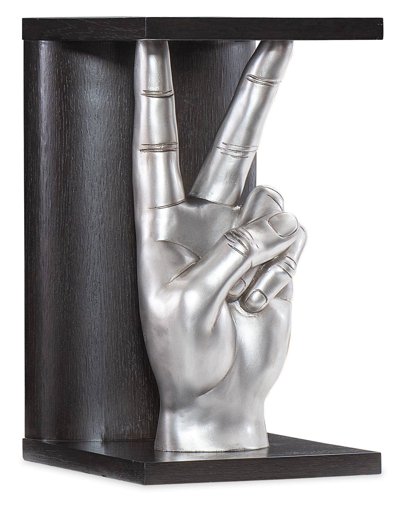 这款 Commerce & Market 边桌设计休闲大胆,兼具都市与部落风情。银色“和平”手势标志与橡木贴面下的黑色木质饰面形成鲜明对比,并饰以树脂。