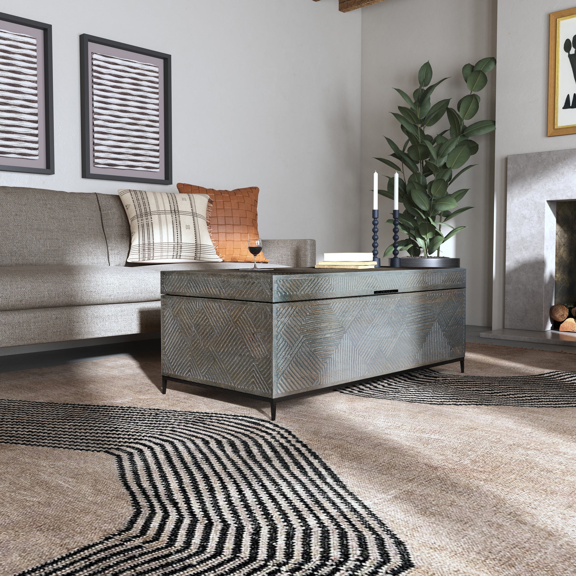 这款 Commerce & Market 雕花箱式鸡尾酒桌质感丰富,触感独特,散发着浓郁的部落风情,是对经典掀盖式行李箱的现代演绎。