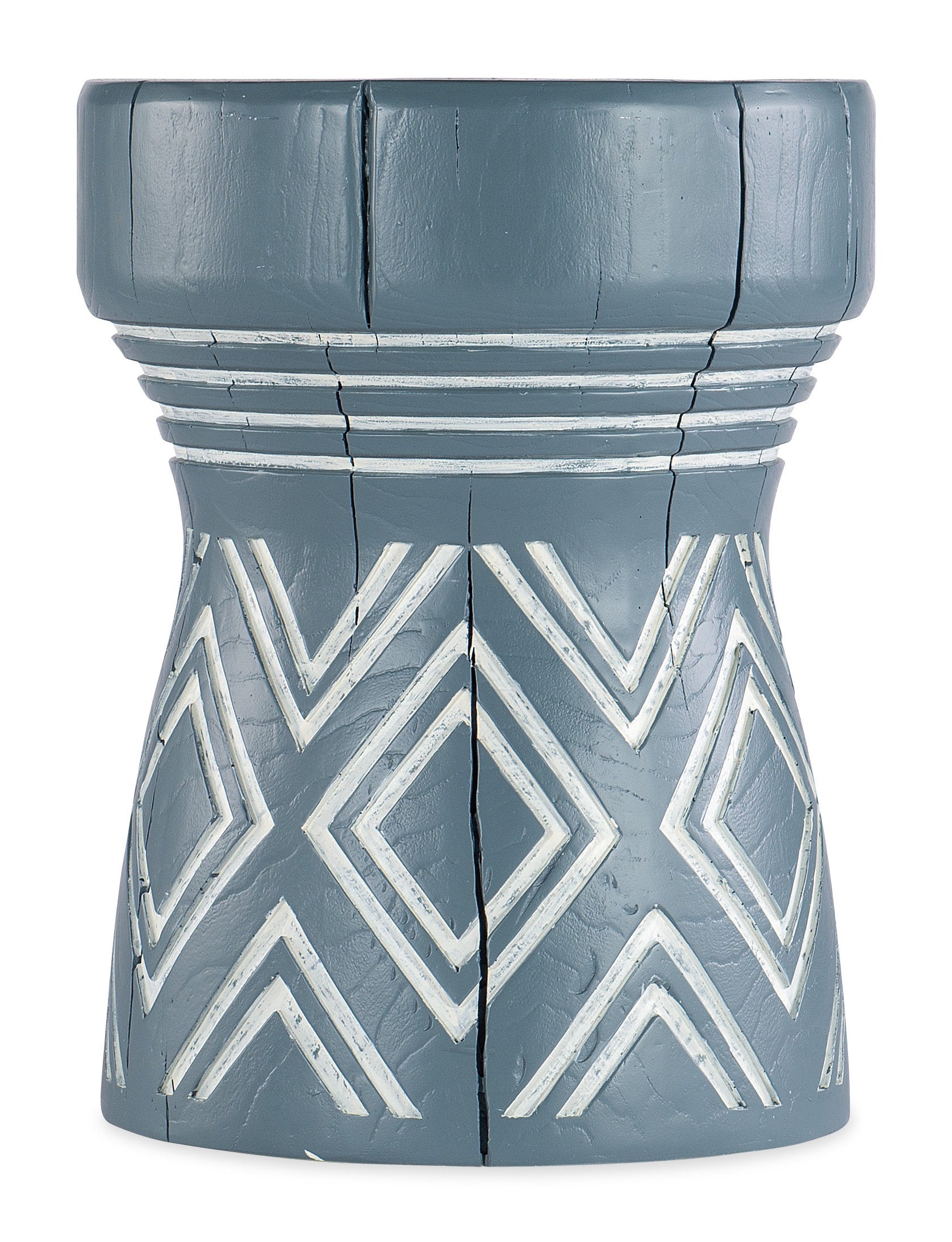这款雕刻树桩边桌采用铸造树脂制成,设计灵感源自大自然古老的树根,并以柔和的蓝色背景手工绘制了醒目的白色几何部落图案。