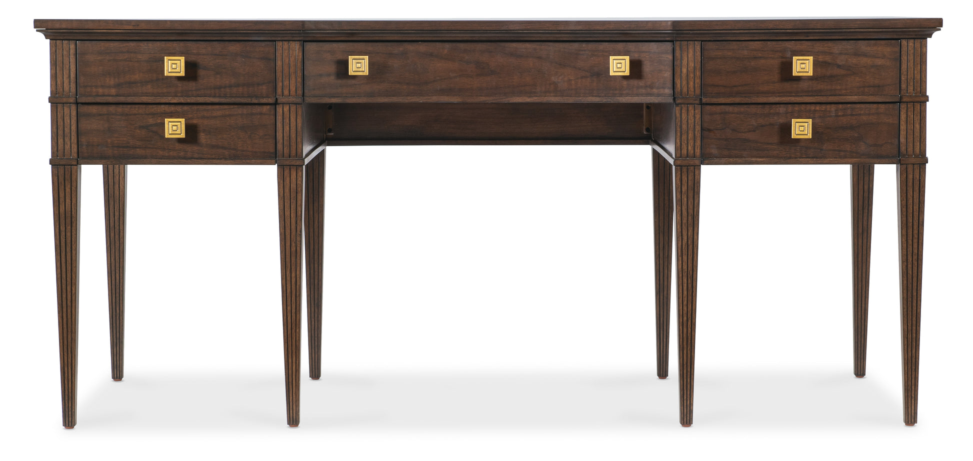 这款办公桌采用经典的欧式风格,以纹理优美的胡桃木贴面打造而成,并配以过渡风格的金色方形旋钮,使其成为一件风格百搭的家具。