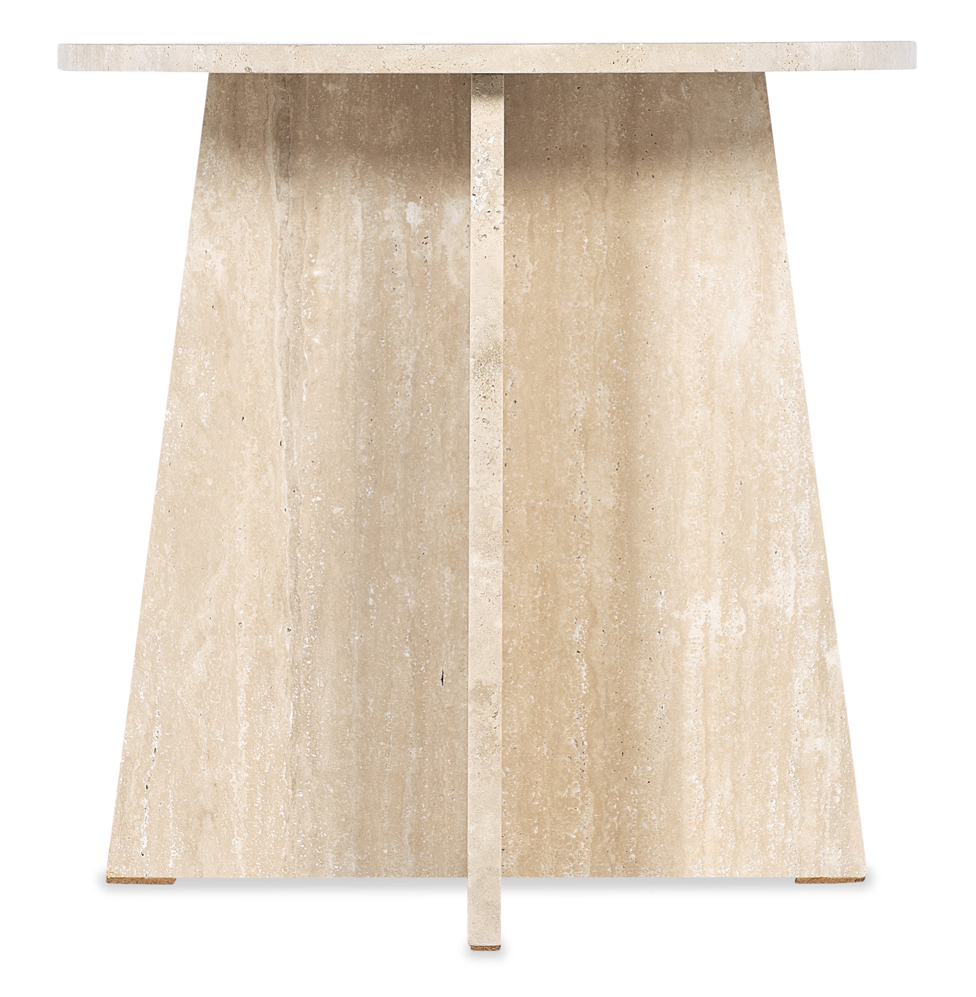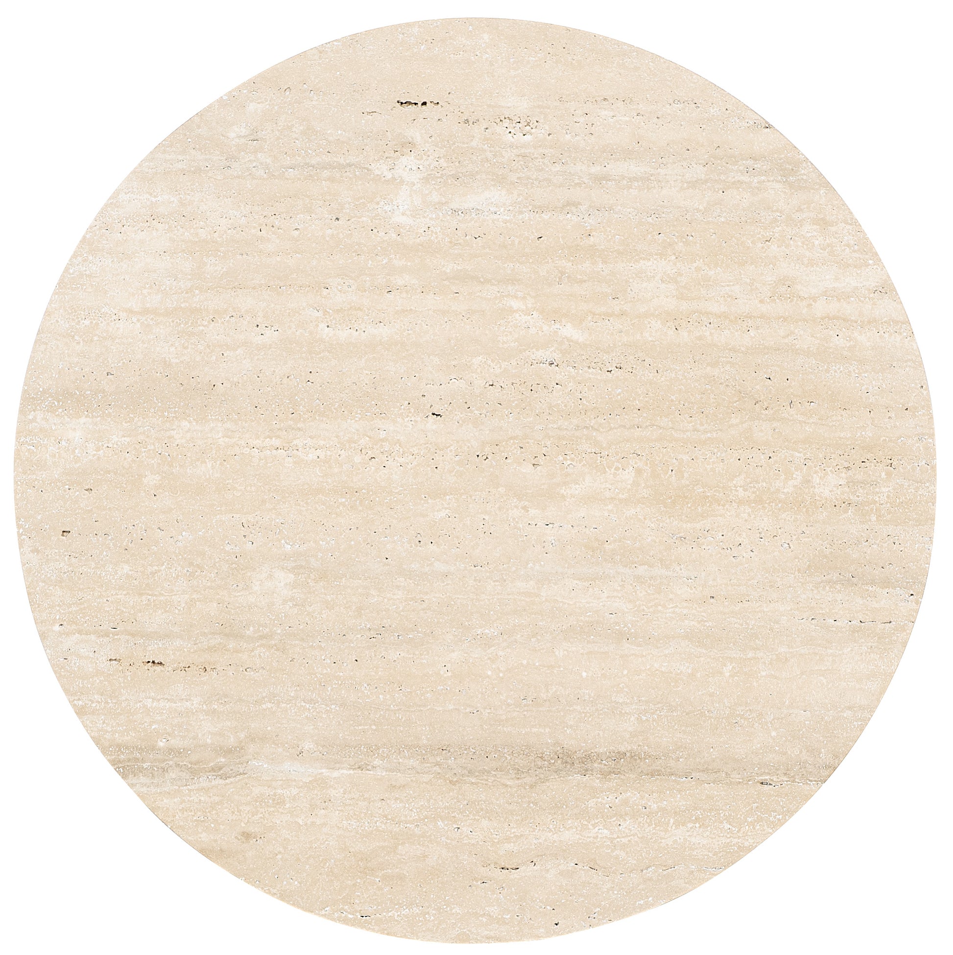 这款圆形边桌采用洞石桌面和底座,并配有锥形底座设计。