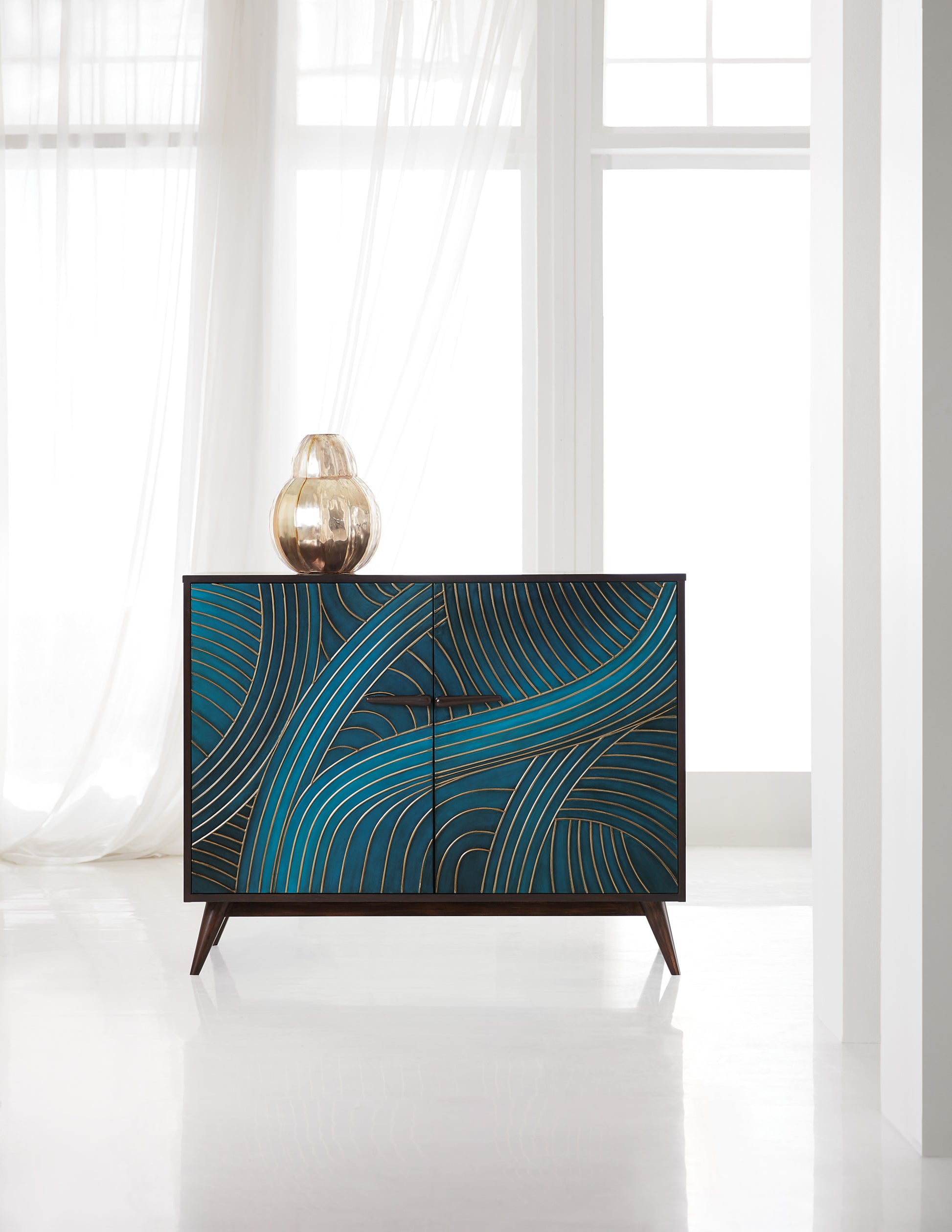 • 凸起的青绿色石膏漆面,以金色石膏漆呈漩涡状点缀,营造出触感美感。