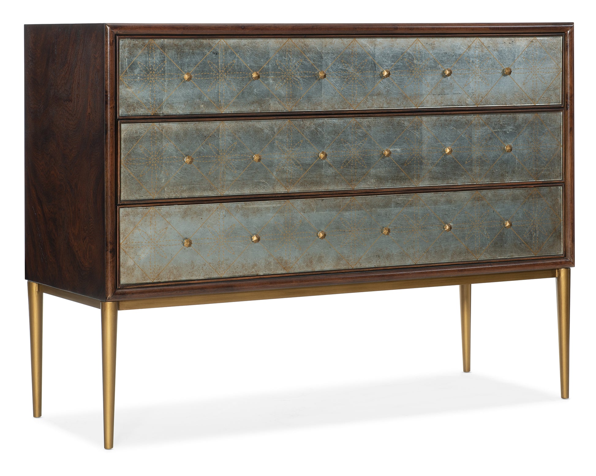 这款优雅永恒的Estrella三屉柜采用旋纹桃花心木打造,并饰以玻璃、银箔和金属,深色木质饰面搭配银色玻璃门和纤细的金色柜腿。
