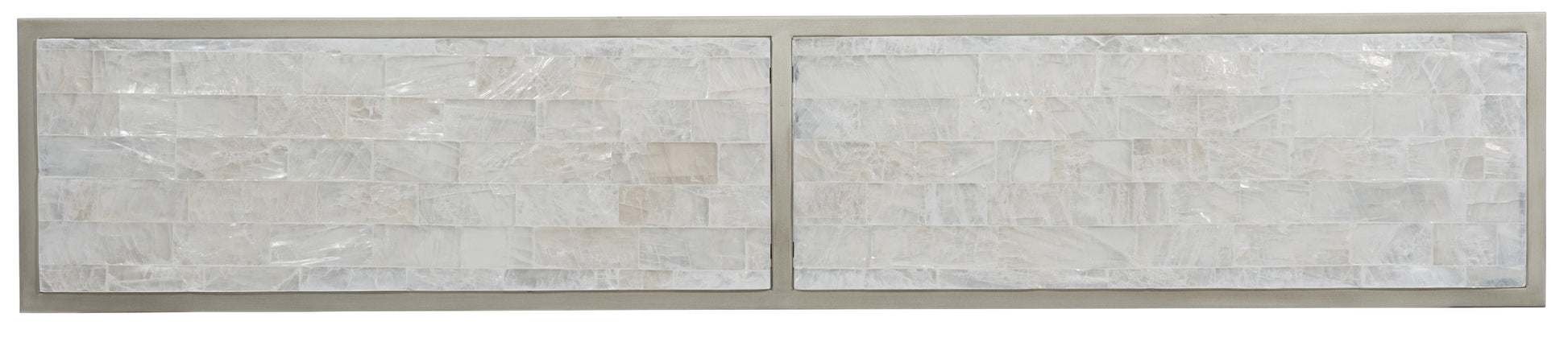 • 引人注目的四叶形镂空雕花赋予金门控制台艺术气息和轻盈感,香槟色金属底座与哑光石膏石台面完美融合。