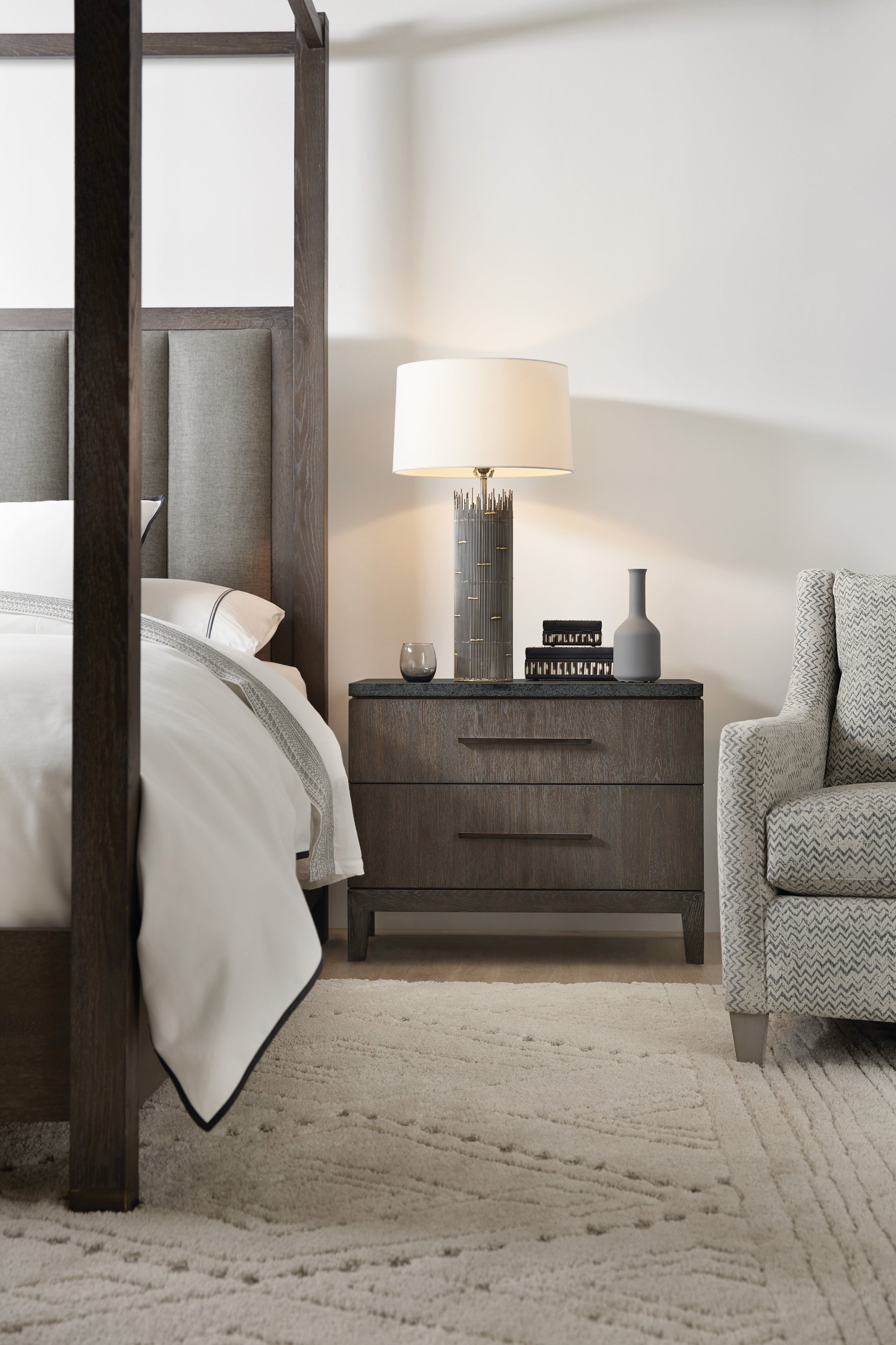 这款 Aventura San Marcos 床头柜散发着浓郁的国际化气息,采用质感丰富的烟熏阿拉比卡色饰面,搭配触感细腻的白橡木和松木节疤橡木贴面,并以蓝石台面点缀。