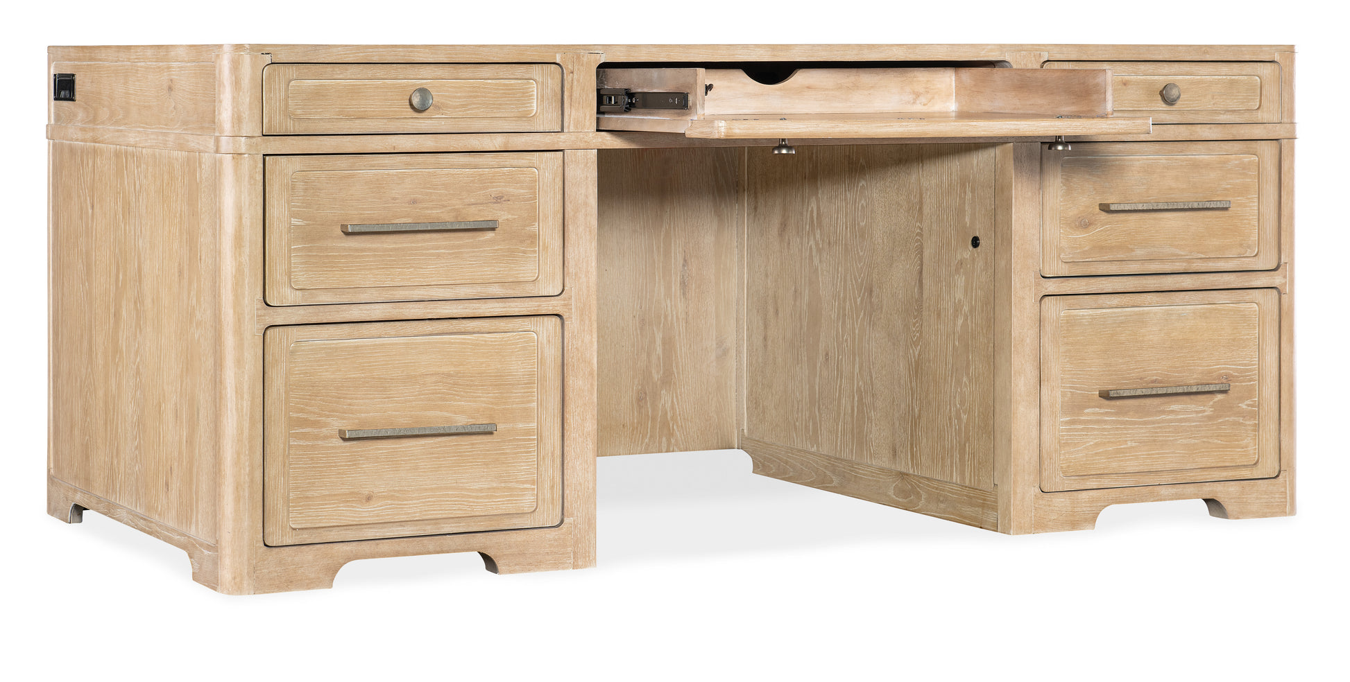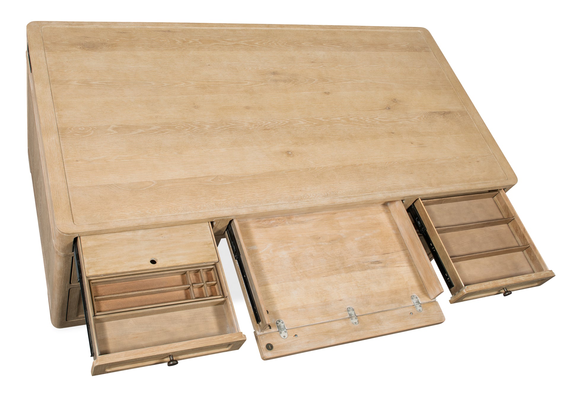 • 功能特点包括七个抽屉,左右两侧最上面的抽屉各有两个可拆卸隔板,一个笔槽和一个可左右互换使用的书写滑轨