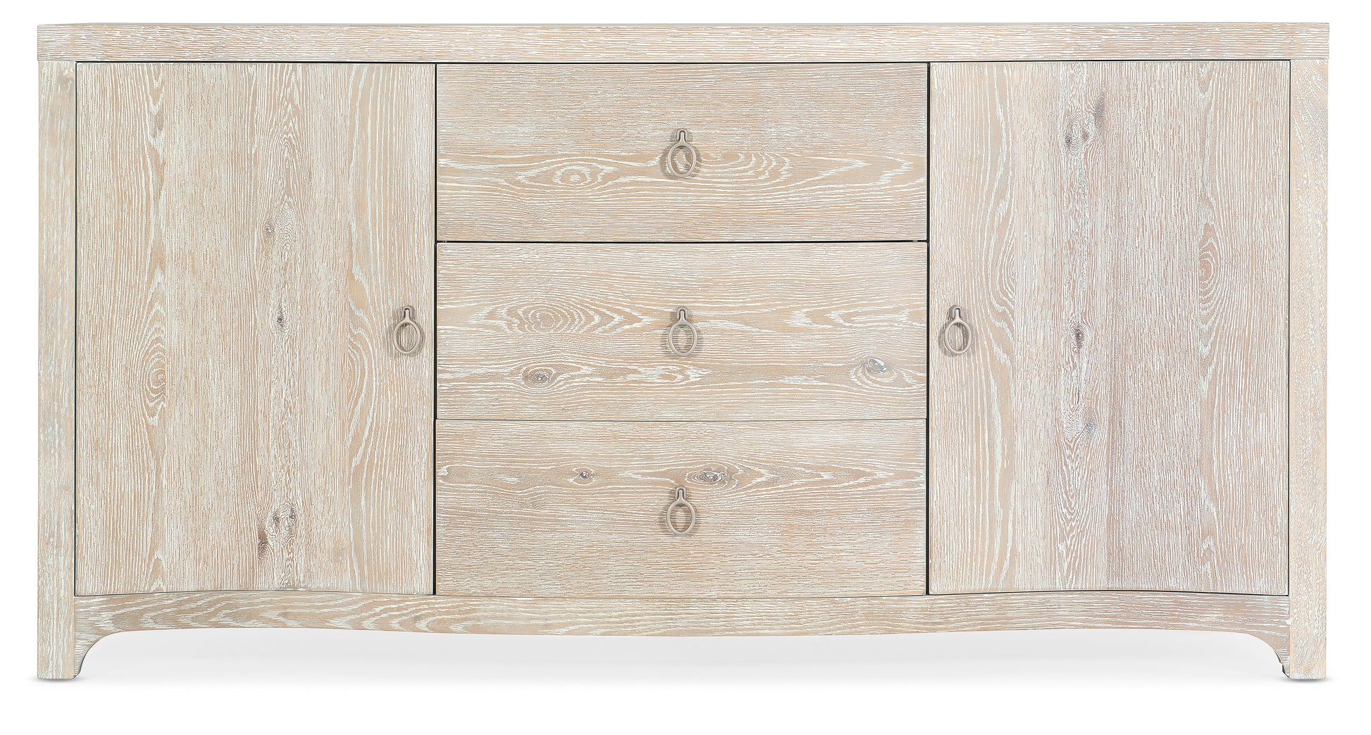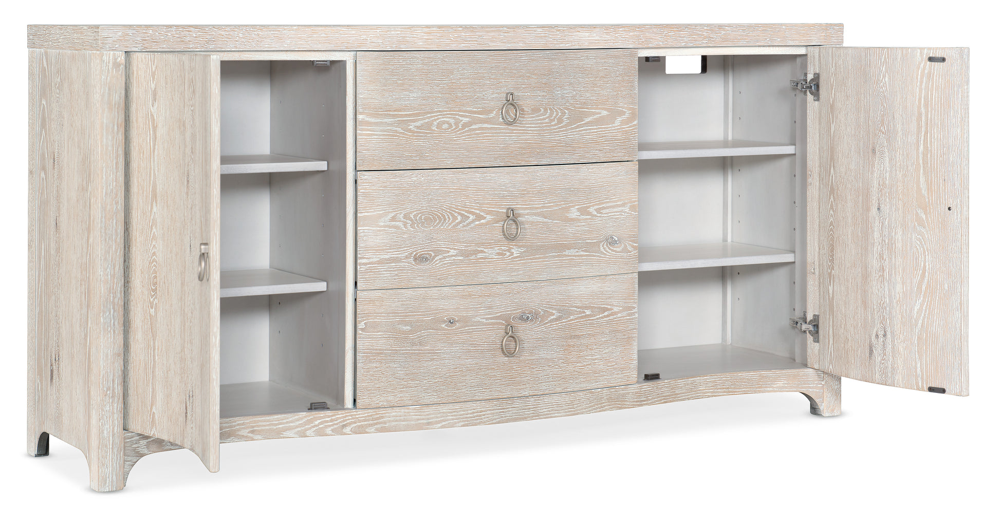• Serenity 餐边柜采用轻盈通透的白色水洗和钢丝刷橡木饰面,搭配柔和的蛇形柜体,将户外轻松惬意的氛围带入室内。